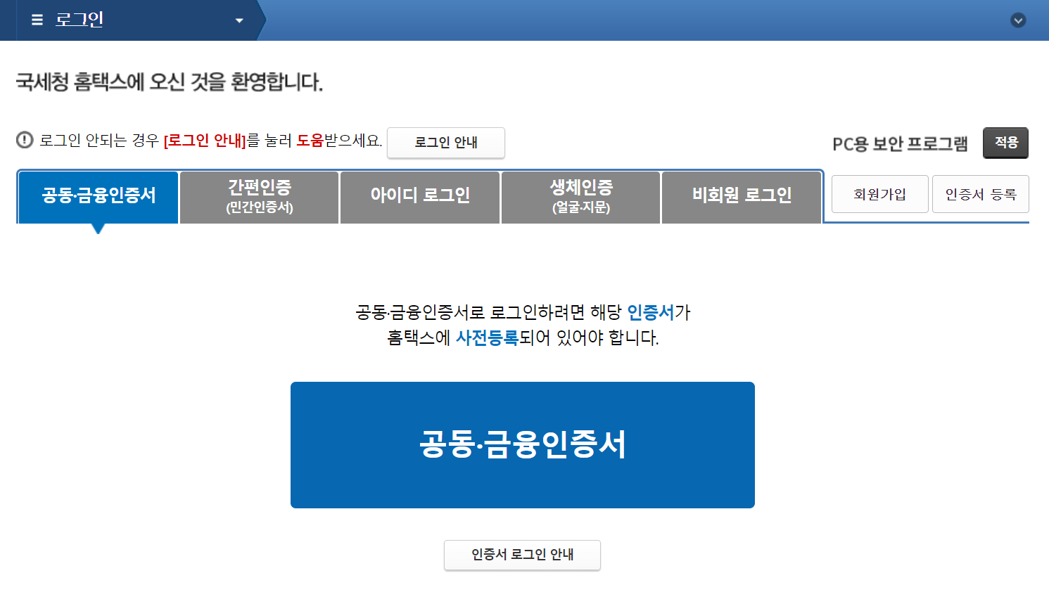 2. 공동.금융인증서 / 간편인증(민간인증서) / 아이디 로그인 / 생체인증(얼굴,지문) / 비회원 로그인 중에 선택하여 편한 방법으로 로그인