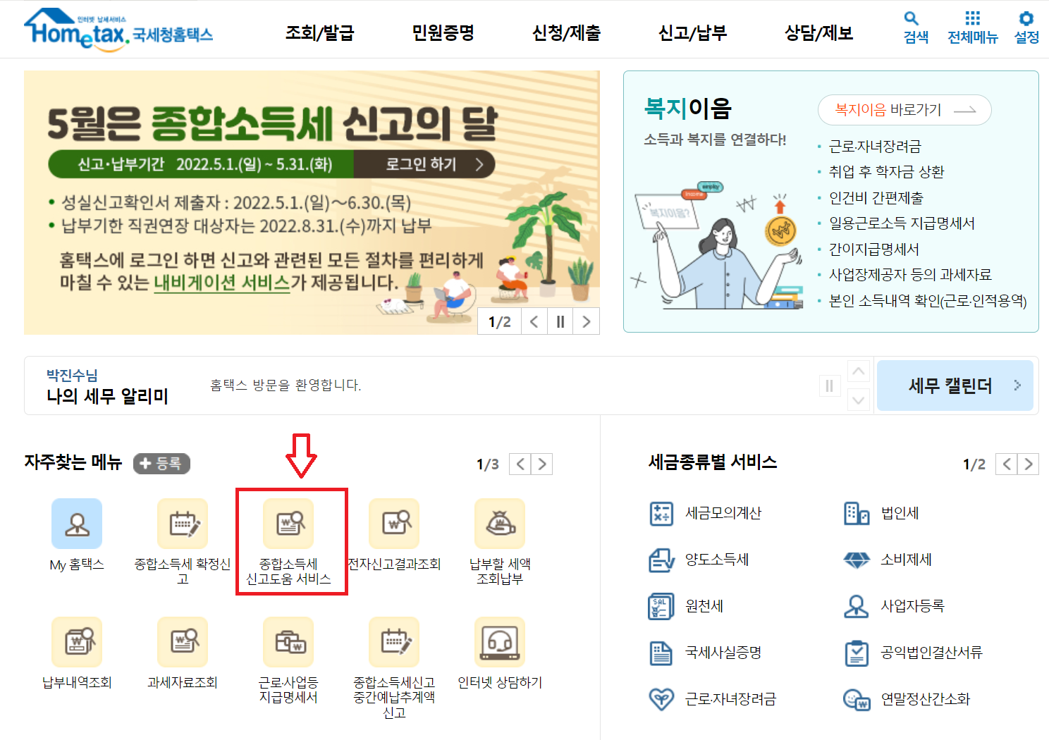 3. 메인 홈 화면에 “종합소득세 신고도움 서비스”를 클릭