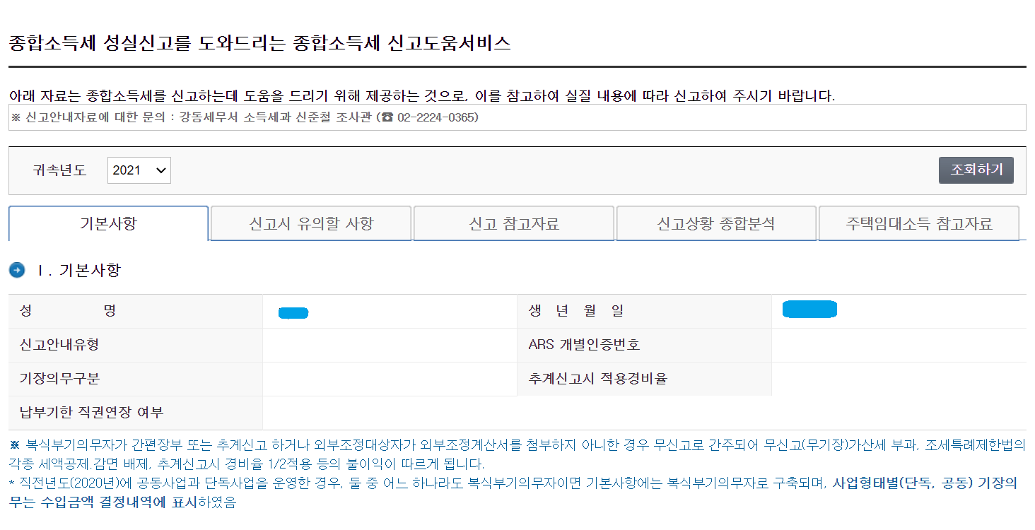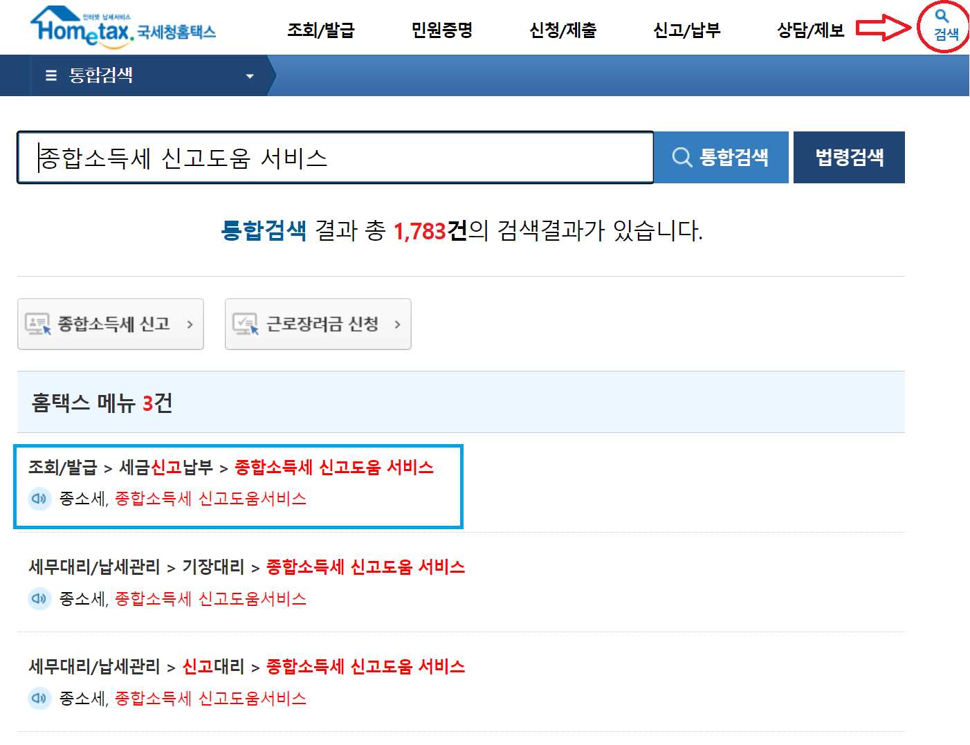 검색버튼을 눌러서 “종합소득세 신고도움 서비스“로