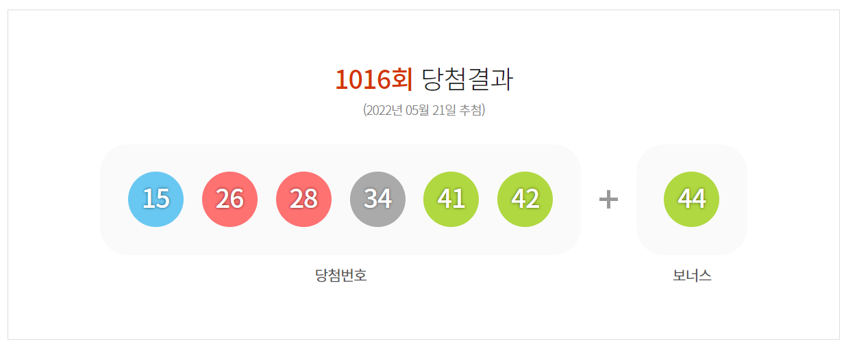1등 로또 당첨번호는 15,26,28,34,41,42 (보너스 번호 44) 입니다