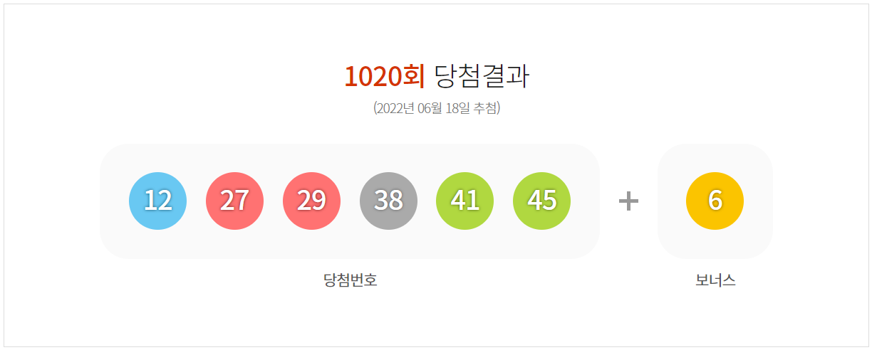 1등 로또 당첨번호는 12,27,29,38,41,45 (보너스 번호 6) 입니다