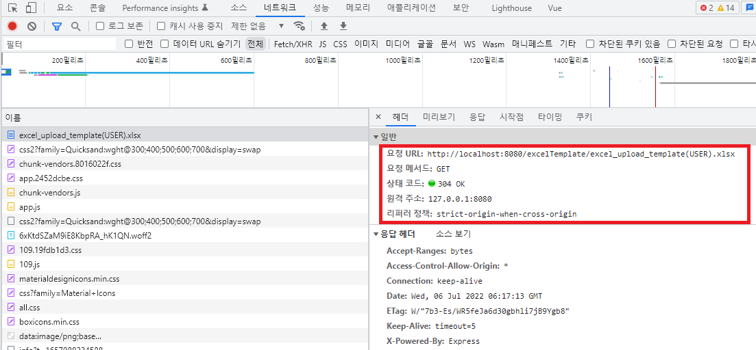 이때 파일 변경시간과 크기등이 서로 같으면 서버는 304 로 응답합니다.