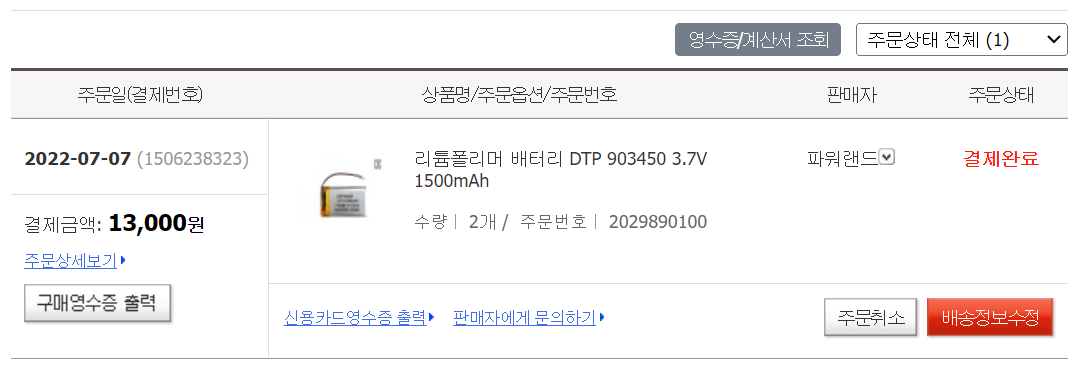 DTP903450 3.7V 1500mAH (리튬폴리머) 배터리가 구매하기 (사용중인 배터리가 부풀어 올라서 터질 것 같다.)