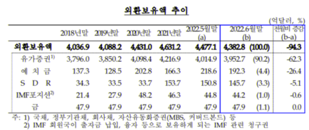 2022년 6월말 우리나라 대한민국의 외환보유액은 4,382.8억 달러로 전월말 대비 94.3억 달러 감소하였습니다.