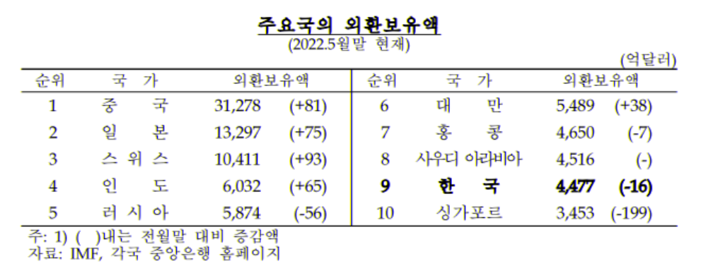 2022년 5월말 기준 우리나라의 외환보유액 규모는 세계 9위