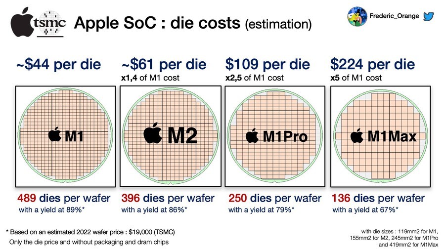 M1 Max 제조 단가가 M1의 5배라고 보면 되나? 그렇다라고 했을 때 M1 Ultra는 최소 10배일까?