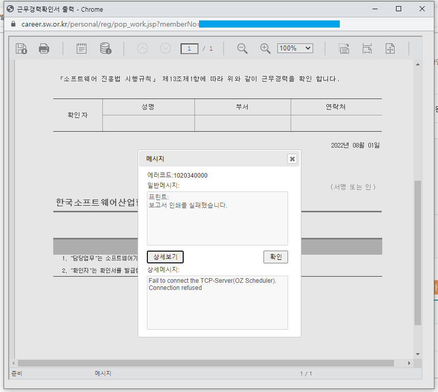 KOSA 사이트에서 근무경력확인서를 출력하려고 보니 오류가 발생한다.