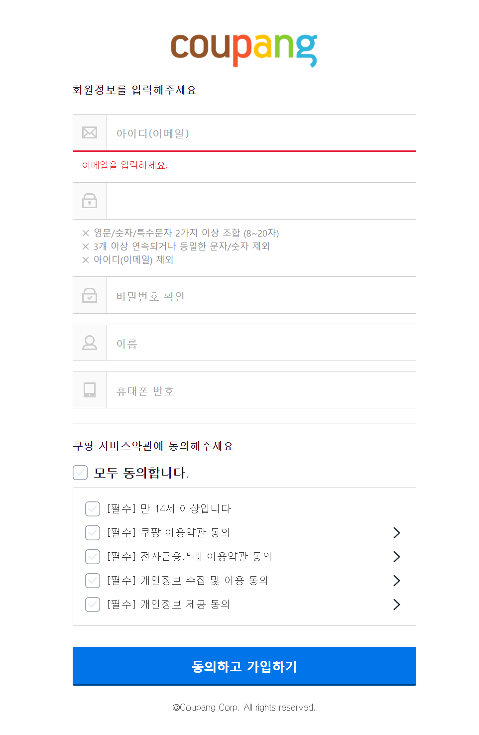아이디, 비밀번호, 이름, 휴대폰 번호를 작성합니다. 그리고 난 후 하단에 약관 5개 모두 동의를 체크합니다. 동의하고 가입하기 버튼을 클릭하여 다음으로 이동합니다.