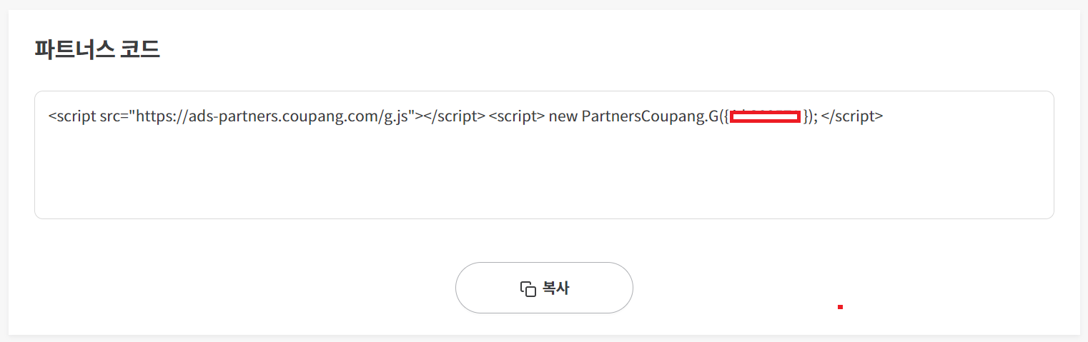 필요한 정보를 모두 기입후 배너 만들기 버튼을 클릭하면 파트너스 코드가 생성됩니다. 복사해서 티스토리 배너에 추가해줍니다. 그러기위해서 본인의 티스토리 환경설정으로 이동합니다.