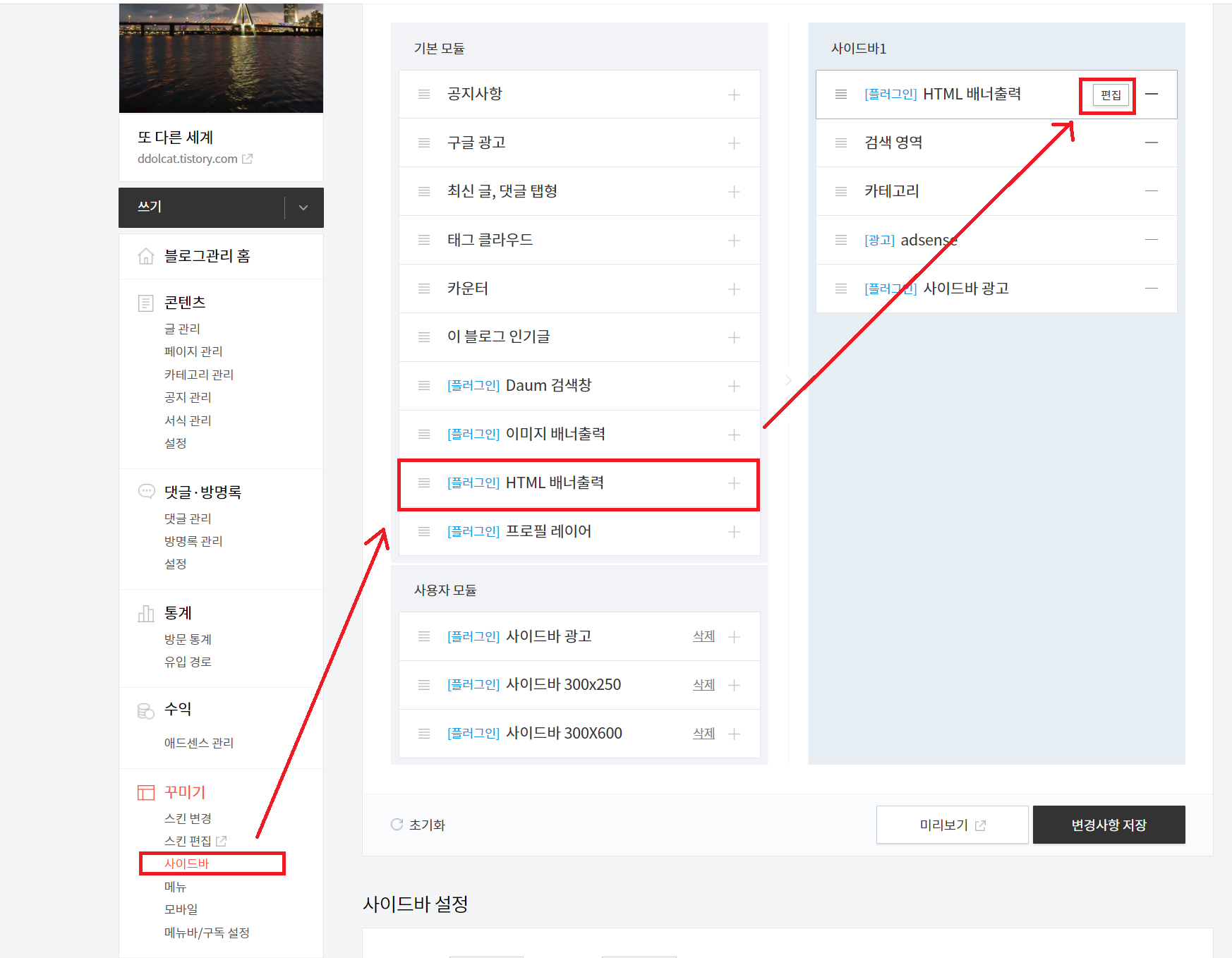 [플러그인]HTML배너출력을 클릭 후 편집 버튼을 클릭합니다.