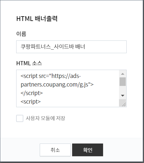 쿠팡파트너스에서 생성한 다이나믹 배너 파트너스 코드를 HTML소스 란에 붙여넣어주고 확인버튼을 클릭합니다.