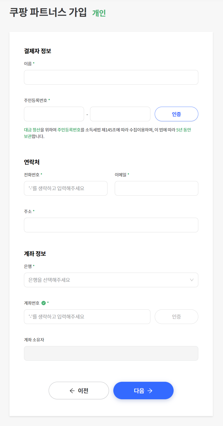 결제자 정보를 등록해야합니다. 이름과 주민등록번호, 전화번호, 이메일, 계좌 정보 모두 입력해야합니다. 상당히 많은 개인정보가 수집되네요. 아마도 연말정산을 위한??? 모두 입력하고 다음 버튼을 클릭하면 가입이 완료됩니다.