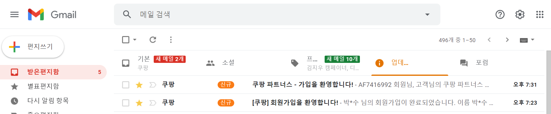 그리고 쿠팡으로 부터 회원가입 관련 메일이 2건 옵니다.