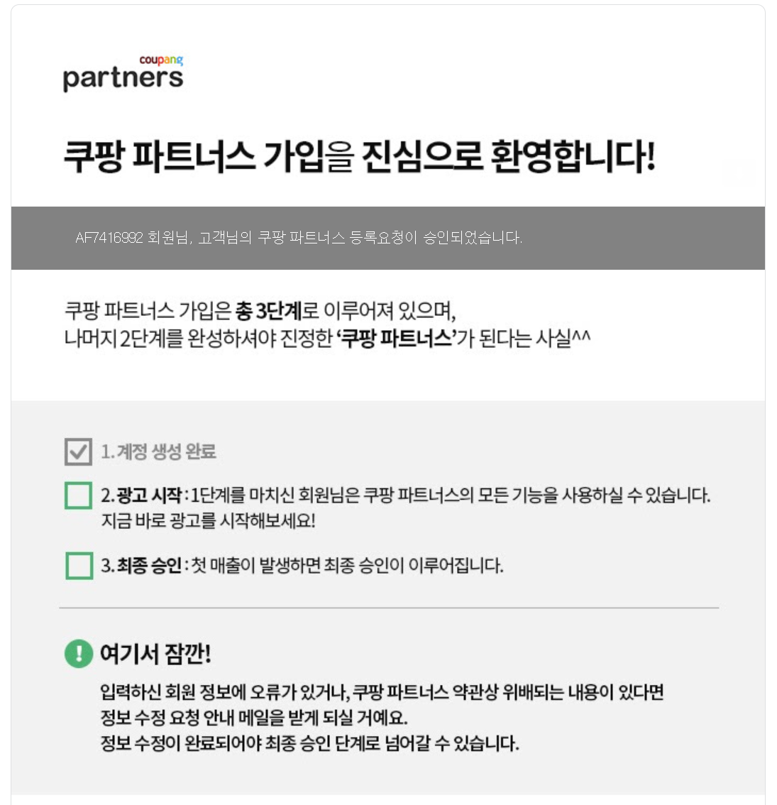 메일 내용을 확인보면, 최종적으로 파트너스가 되러면 배너를 달고 첫 매출이 발생해야 최종승인이 됩니다.