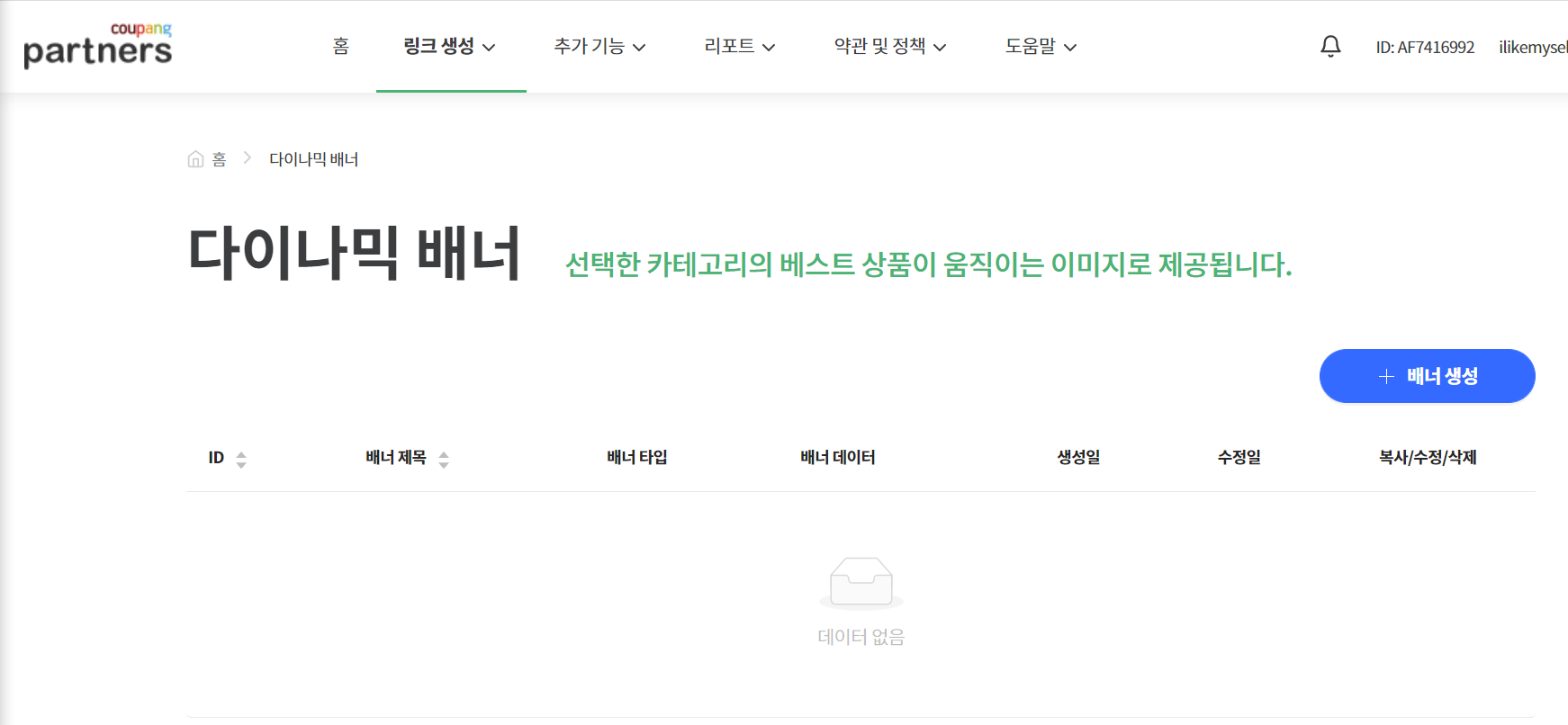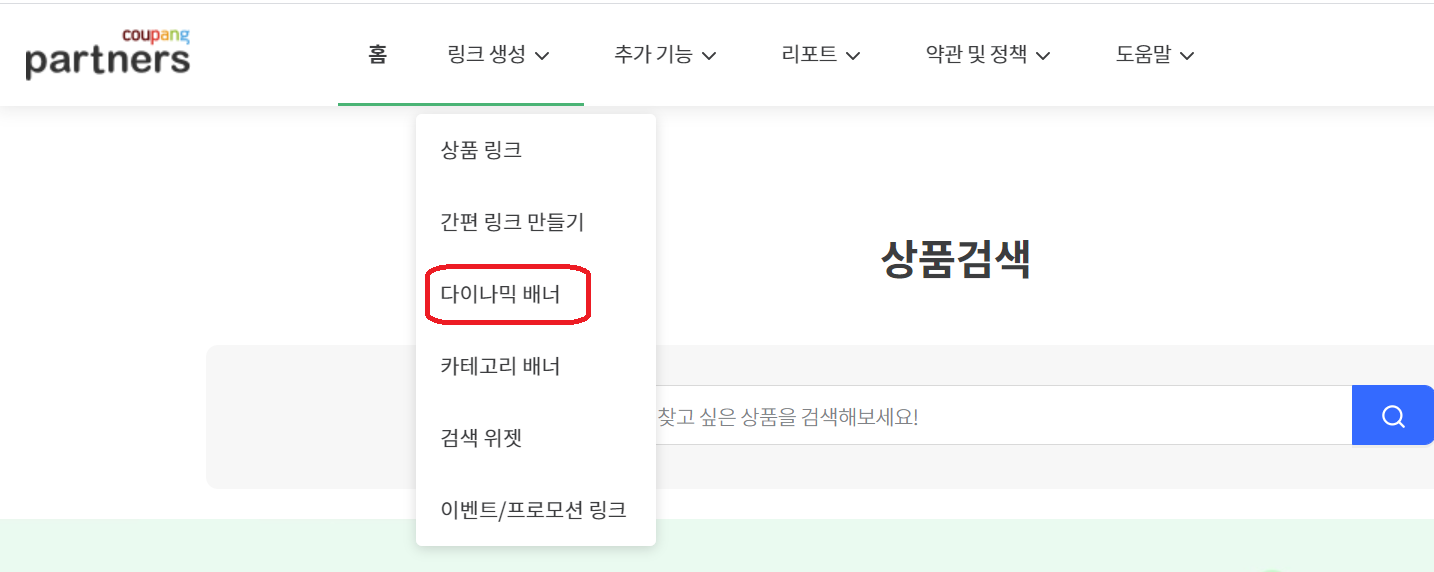 쿠팡 파트너스 사이트에 로그인을 하면 상단바에 메뉴들이 있습니다. 여기에서 다이나믹 배너를 클릭합니다.