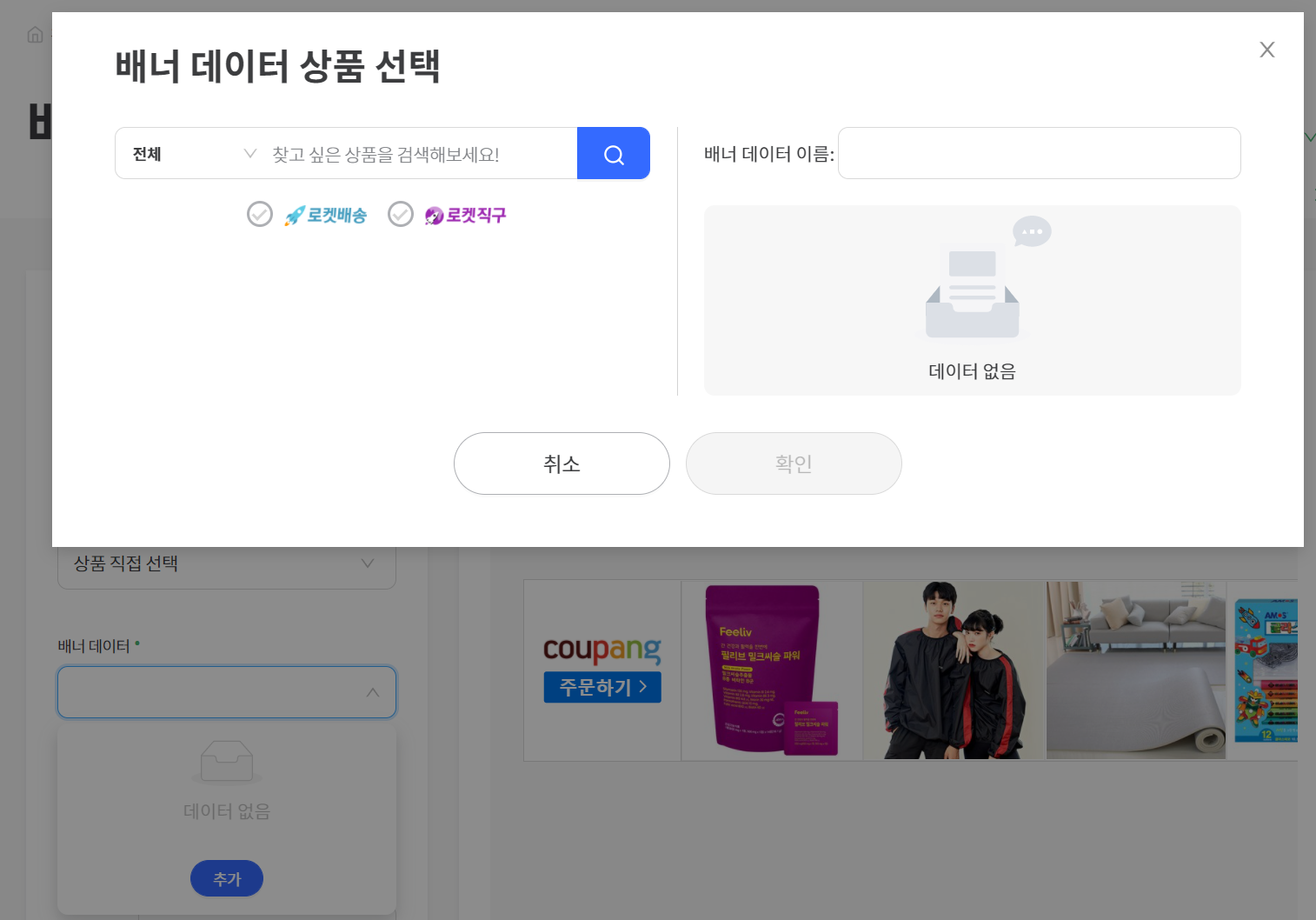 상품 직접 선택을 선택한 경우에는 배너 데이터에서 추가 버튼을 클릭 후 상품을 찾아서 추가 후 확인버튼을 클릭합니다.