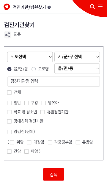 검진기관찾기 검색 조건 옵션으로 휴일검진기관, 장애친화 검진기관, 암검진(위암, 대장암,자궁경부암,간암,유방암,폐암), 학교 밖 청소년,구강, 영유아, 검진기관명, 시/군/구, 도로명, 읍/면/동 등을 제공합니다.