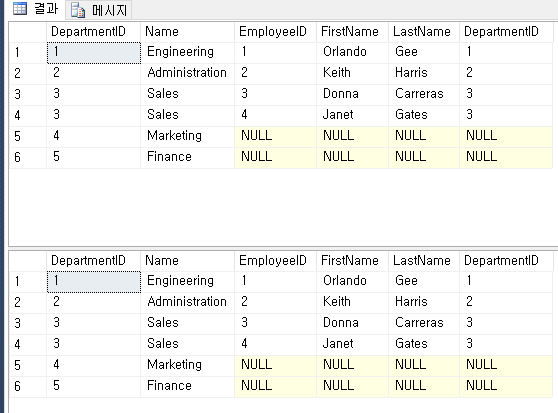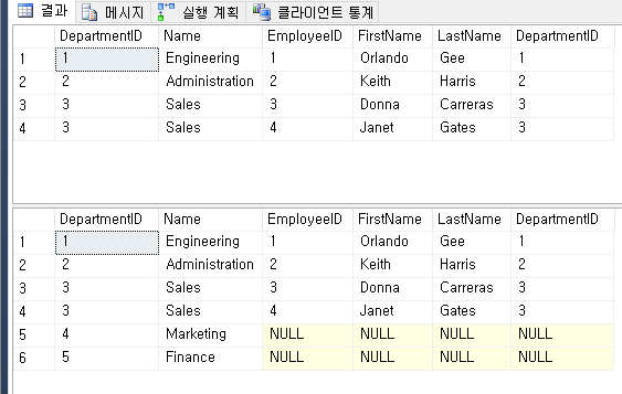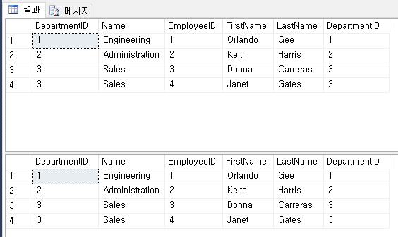 CROSS APPLY 와 OUTER APPLY를 사용하여 Department 테이블과 조인하여 조회한 결과이다.