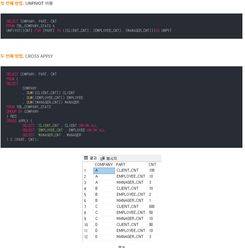 cross apply를 사용하면 아래와 같이 UNPIVOT 효과를 볼 수 있다.