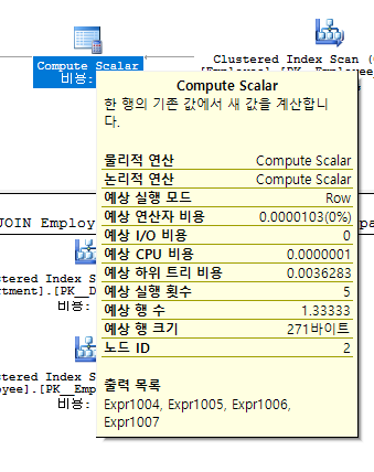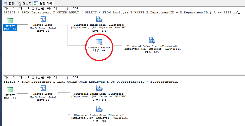 OUTER APPLY를 사용한 쿼리는 Nested Loops 연산자보다 먼저 Compute Scalar 연산자(예상 연산자 비용 0.0000103 또는 약 0%)를 사용하여 Employee 테이블의 컬럼을 평가하고 생성한다.