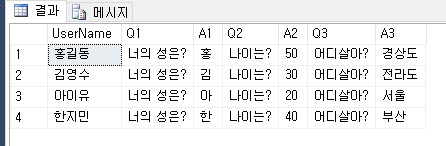 select '홍길동' AS UserName, '너의 성은?' AS Q1, '홍' AS A1, '나이는?' AS Q2, '50' AS A2, '어디살아?' AS Q3, '경상도' AS A3