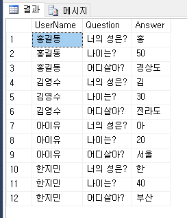select '한지민' AS UserName, '너의 성은?' AS Q1, '한' AS A1, '나이는?' AS Q2, '40' AS A2, '어디살아?' AS Q3, '부산' AS A3