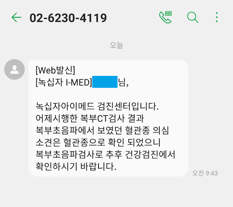 그리고 오늘 오전 9시 43분에 기다리던 결과 문자가 도착했다.