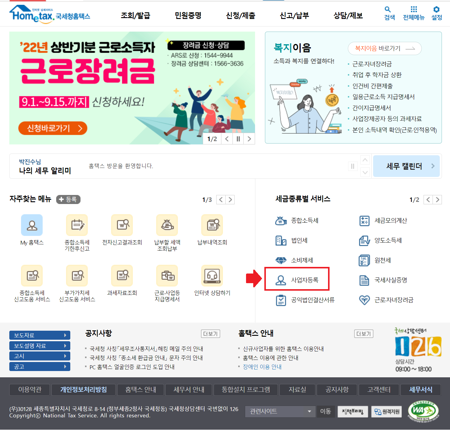 2. 세금종류별 서비스에서 “사업자등록”을 클릭합니다.