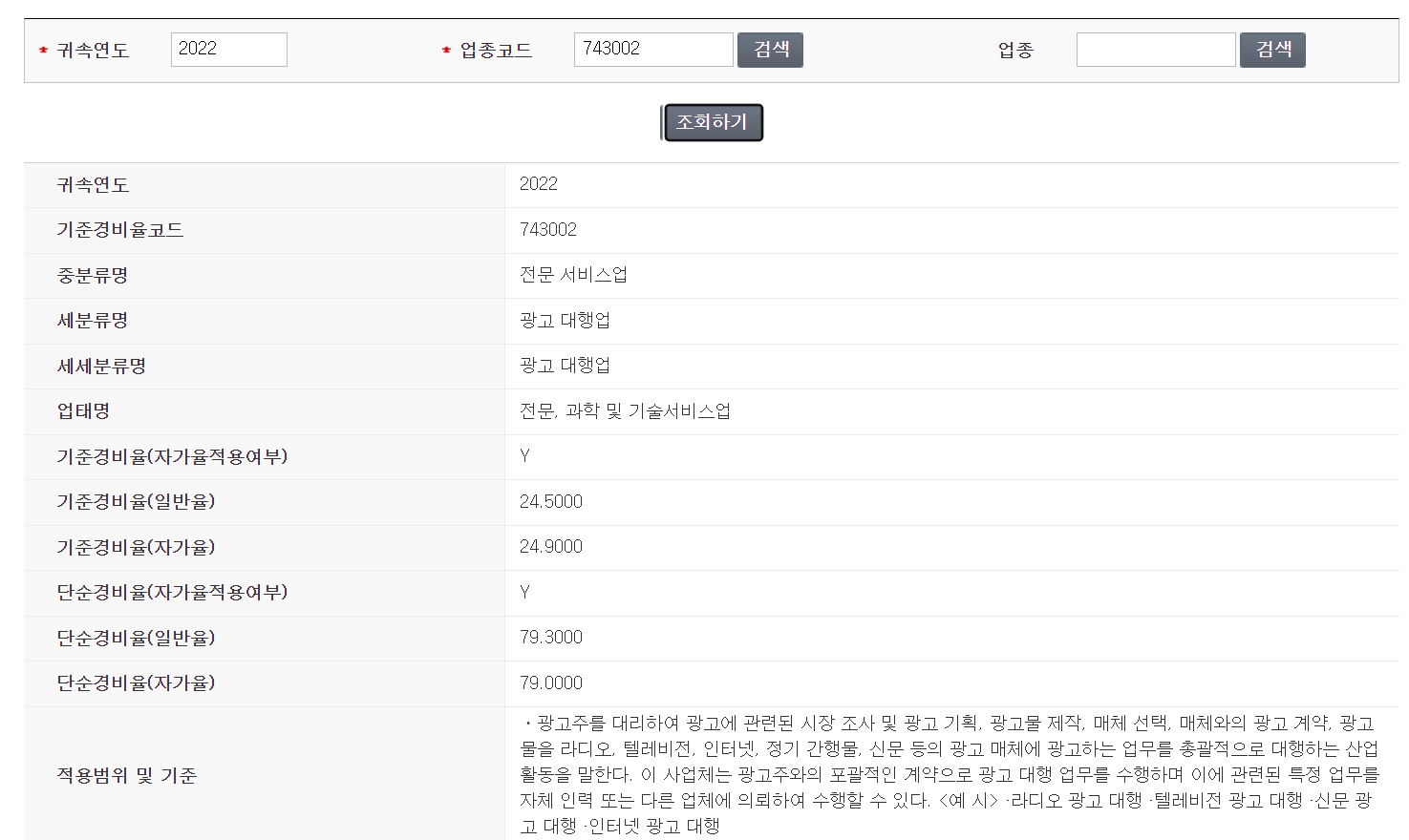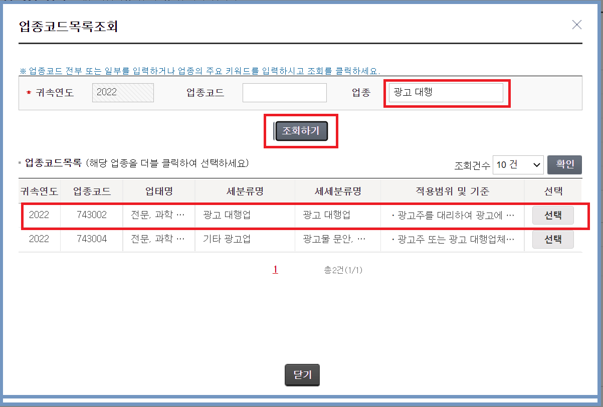 -업종 빈란에 “광고 대행“을 입력 후 “조회하기” 버튼을 클릭합니다.