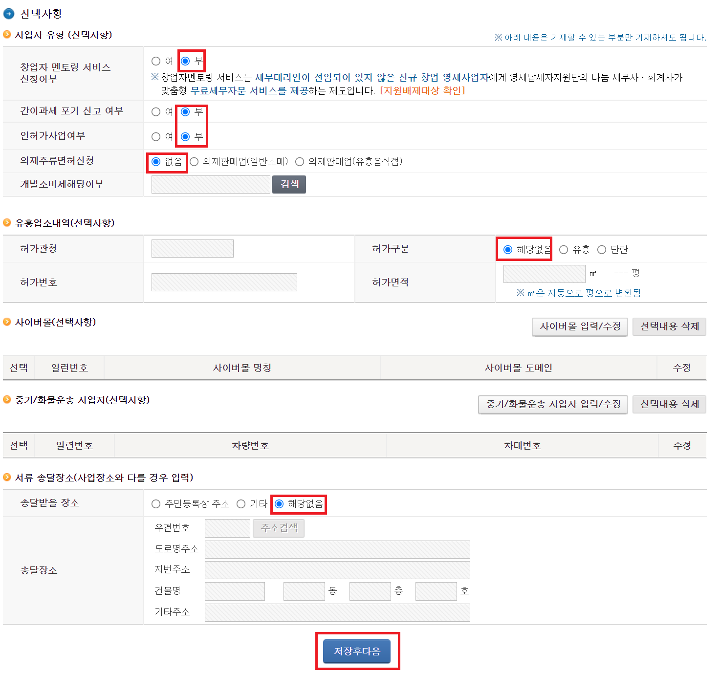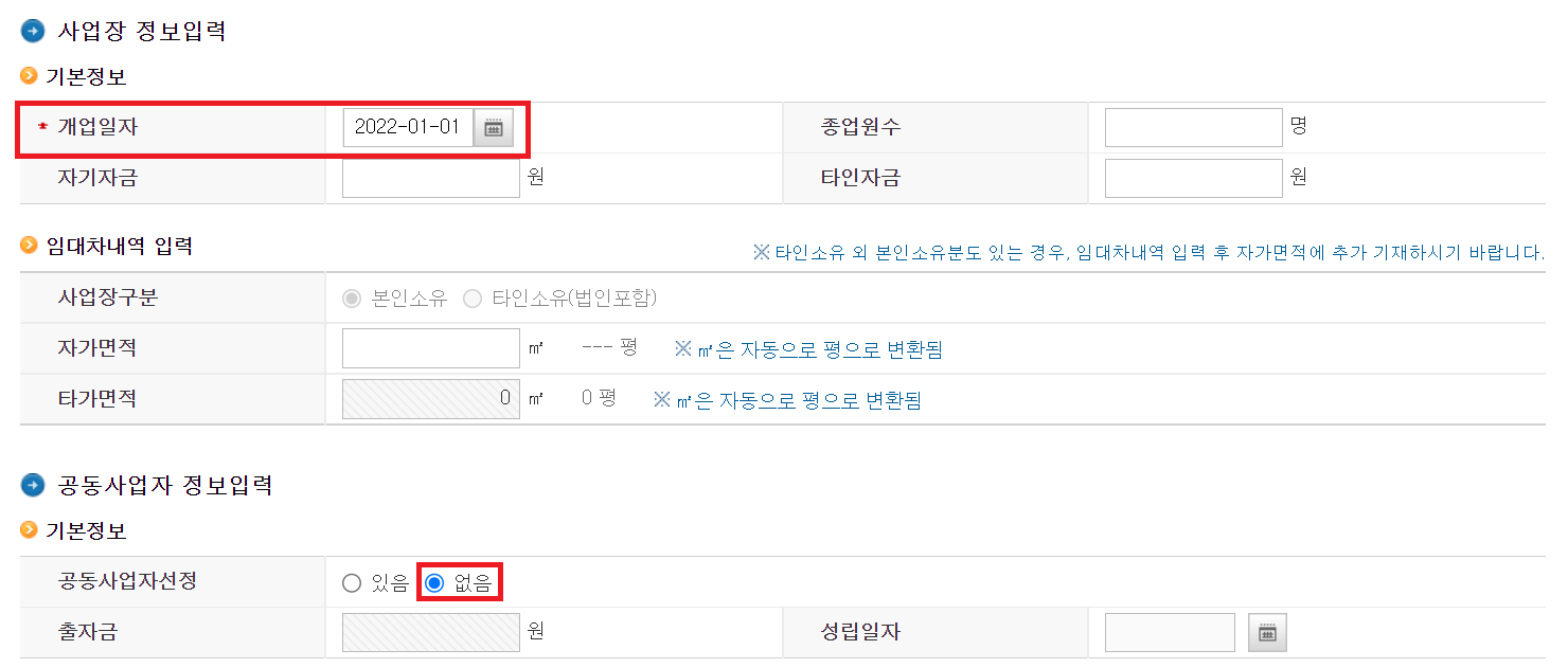 - 공동사업자가 없기 때문에 "없음" 선택하였습니다.