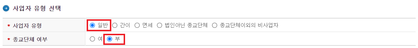 - 업종코드를 743002(광고대행업)으로 등록하는 경우 "간이"를 선택할 수 없습니다. ("일반"을 선택하세요)