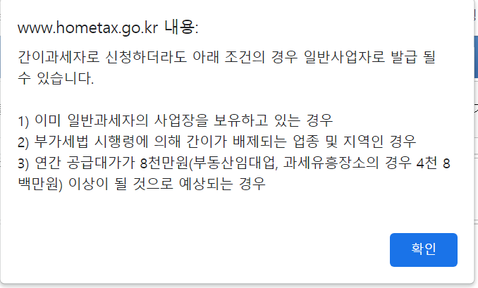 간이과세자를 선택하는 경우 안내 팝업이 하나 나타납니다.