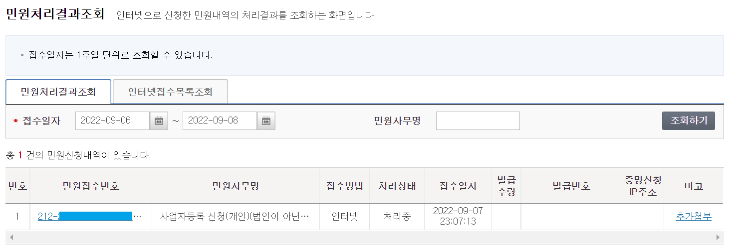 11. 민원처리결과 조회 내용으로 "처리중" 상태로 나타납니다.