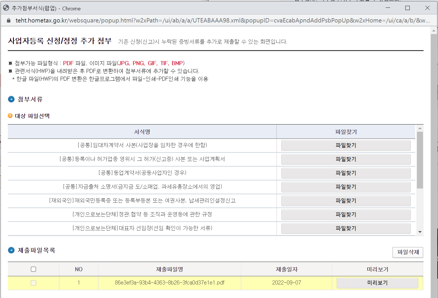 12. 혹시라도 누락하신 서류가 있거나 추가를 하고 싶으면 비고란의 "추가첨부"를 클릭하면 추가로 문서첨부가 가능합니다