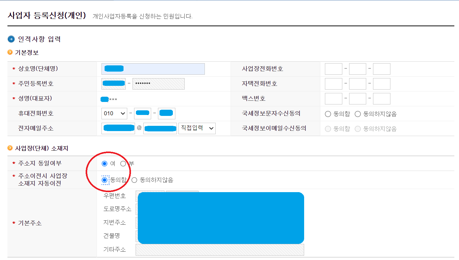 -주소이전시 사업장 소재지 자동이전 사항에 대해서 본인이 원하시면 “동의함”을 선택합니다.