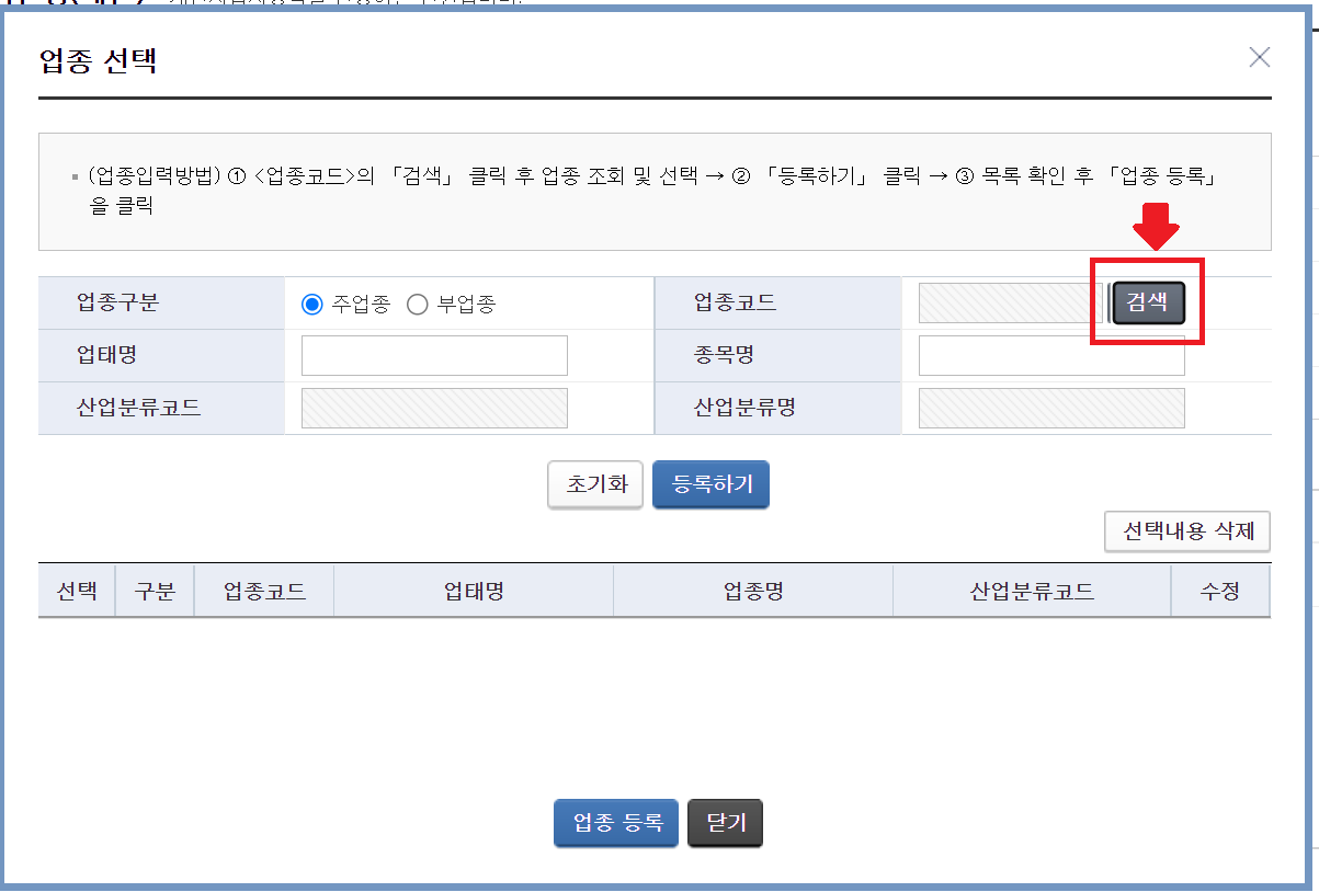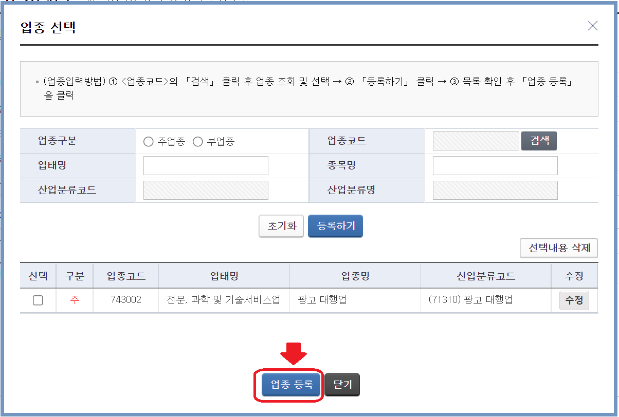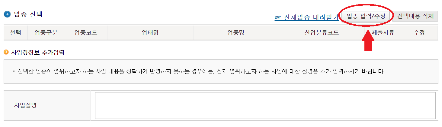 – 업종 입력/수정 버튼을 클릭합니다.
