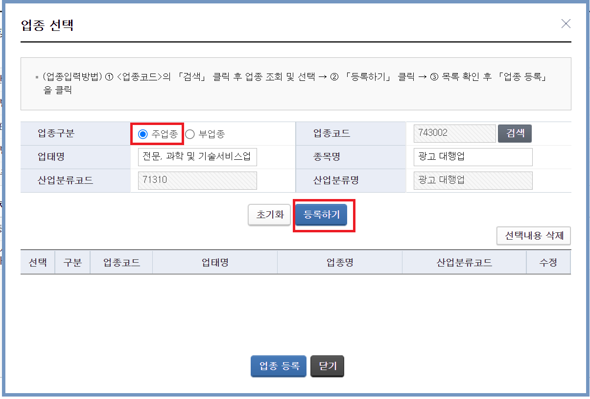 –업종코드 743002를 선택합니다.