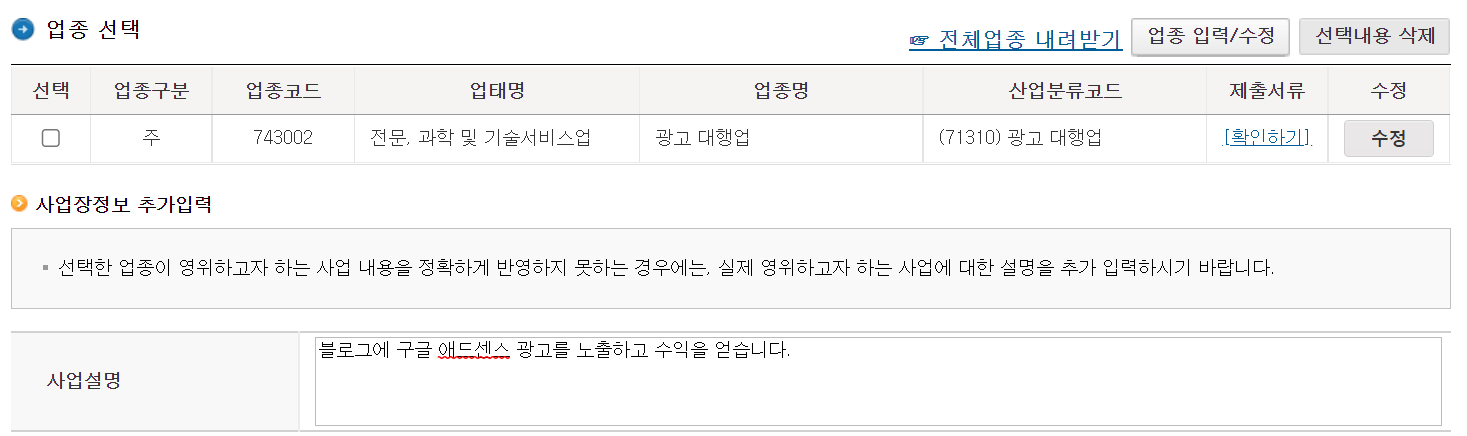 – 사업설명란에 “블로그에 구글 애드센스 광고를 노출하고 수익을 얻습니다.” 라는 설명을 추가했습니다.