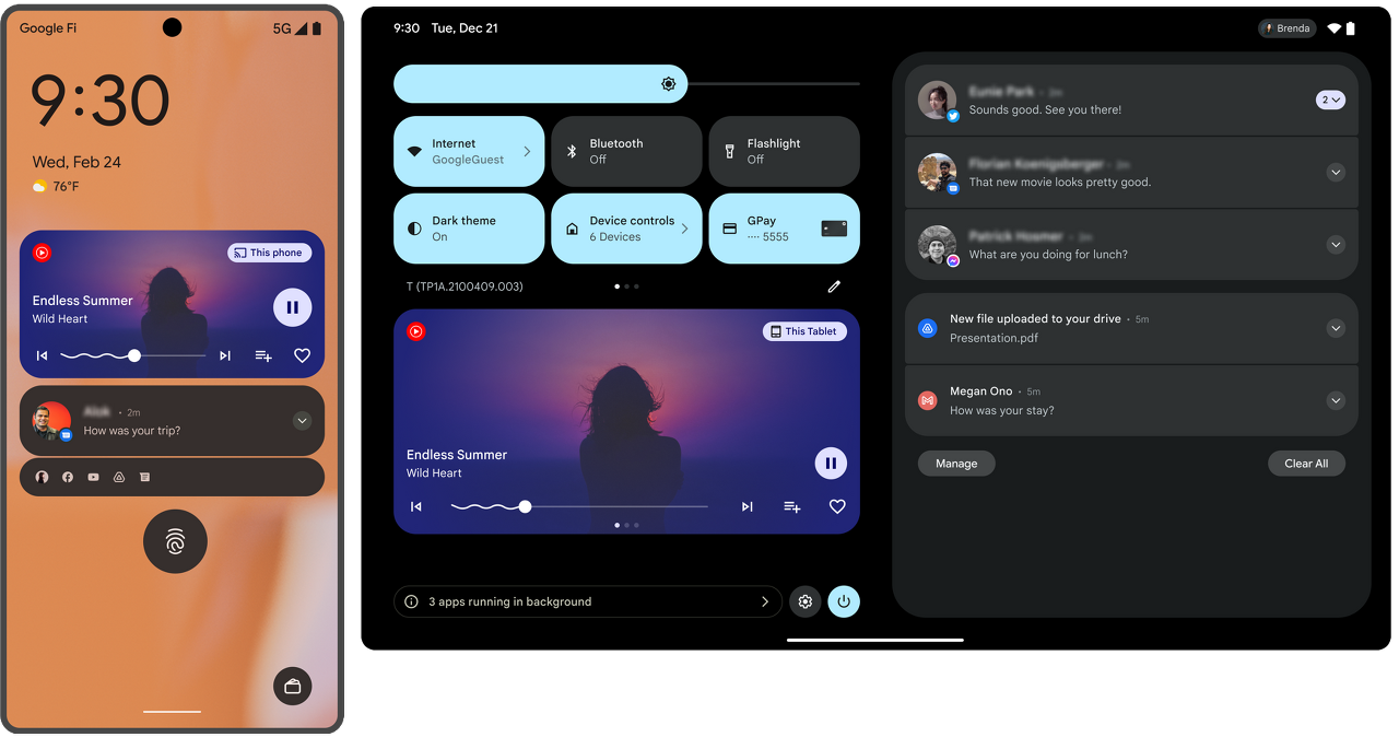 Android 13(API 수준 33) 이상을 타겟팅하는 앱의 경우 시스템은 PlaybackState 작업에서 미디어 컨트롤을 가져옵니다. 이를 통해 시스템은 스마트폰과 태블릿 기기 사이에 기술적으로 일관된 더 풍부한 컨트롤 세트를 표시할 수 있고, Android Auto 및 Android TV와 같은 다른 Android 플랫폼에서 미디어 컨트롤이 렌더링되는 방식과도 일치시킬 수 있게 됩니다.