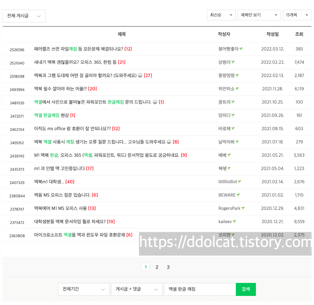 윈도우 기반의 PC를 사용하다가 맥기반의 맥북으로 넘어오니 기존에 없던 불편한 점들이 생기네요. 가장 큰 불편한 점은 키보드의 한/영 변환 키 위치이고 두번째는 엑셀 파일 내의 한글이 깨진다는 점입니다. 맥쓰사 까페에서 엑셀 한글 깨짐 관련 검색을 해보면 많은 검색건이 나옵니다.