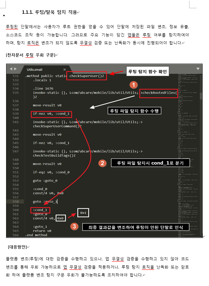 이미 난독화를 하였으나 apk파일을 디컴파일하여 smali파일 값을 변조하여 접근하는 방법으로 루팅탐지 로직을 우회가능하다라고 모의해킹업체에서 대응방안을 주었네요.