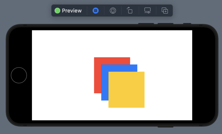 ZStack의 경우 겹겹히 쌓여있기 때문에 최상단의 노란색 사각형만 보여집니다.