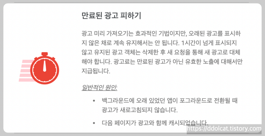 | 광고 미리 가져오기는 효과적인 기법이지만, 오래된 광고를 표시하지 않은 채로 계속 유지해서는 안 됩니다. 1시간이 넘게 표시되지 않고 유지된 광고 객체는 삭제한 후 새 요청을 통해 새 광고로 대체해야 합니다. 광고료는 만료된 광고가 아닌 유효한 노출에 대해서만 지급됩니다. |