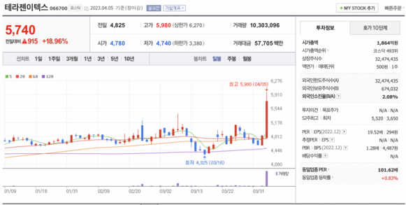 2023년 4월 5일 골든크로스 발생 주식 종목 정보(테라젠이텍스,퍼스텍,제이스코홀딩스,아스플로,에스티오,한솔케미칼,윈하이텍,일신바이오,유니테스트,서울반도체,에쓰씨엔지니어링,한국카본..