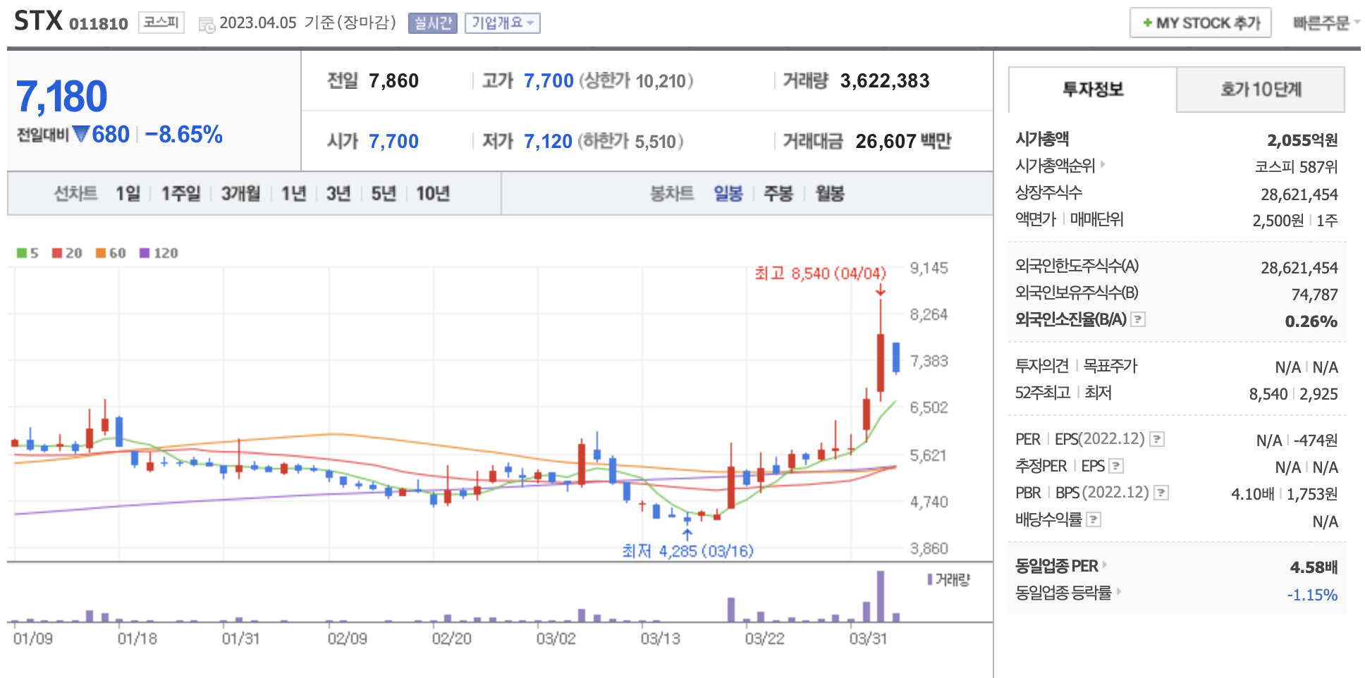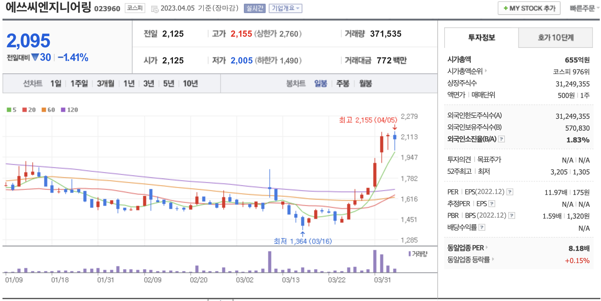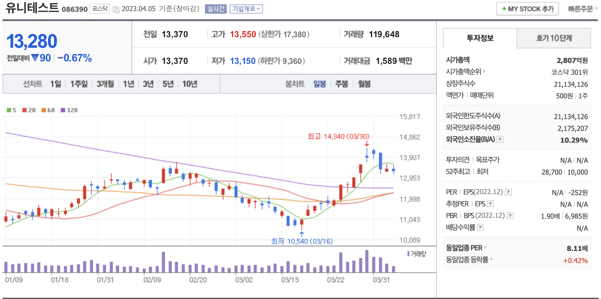 시가총액, 시가총액 순위, 상장주식수, 액면가, 매매단위, 외국인한도주식수, 외국인소진율, 투자의견, 목표주가, 52주 최고, 52주 최저, PER, EPS, PBR, BPS, 배당수익률, 동일업종 PER, 동일업종 등략률 등의 정보를 확인하세요.