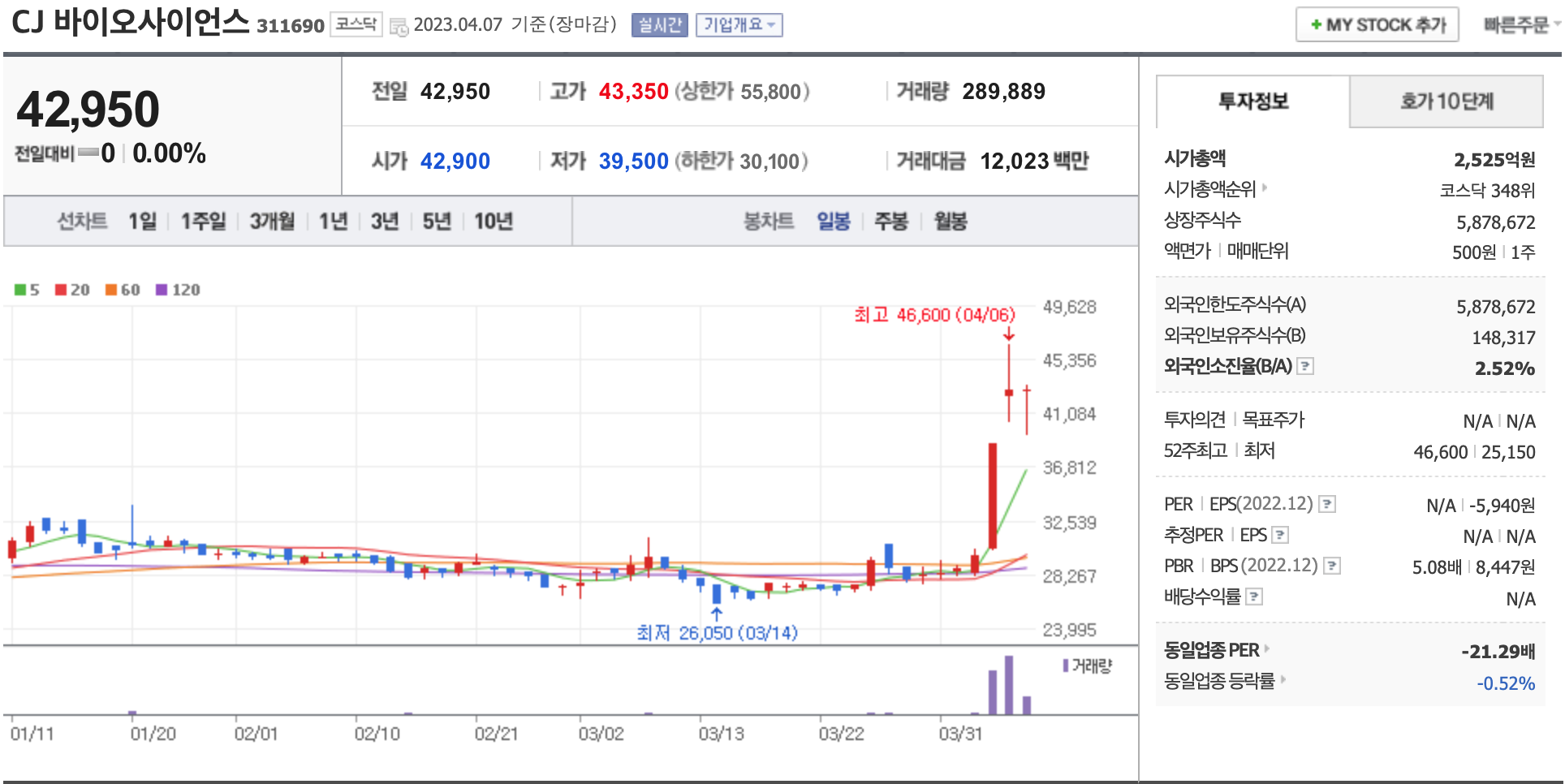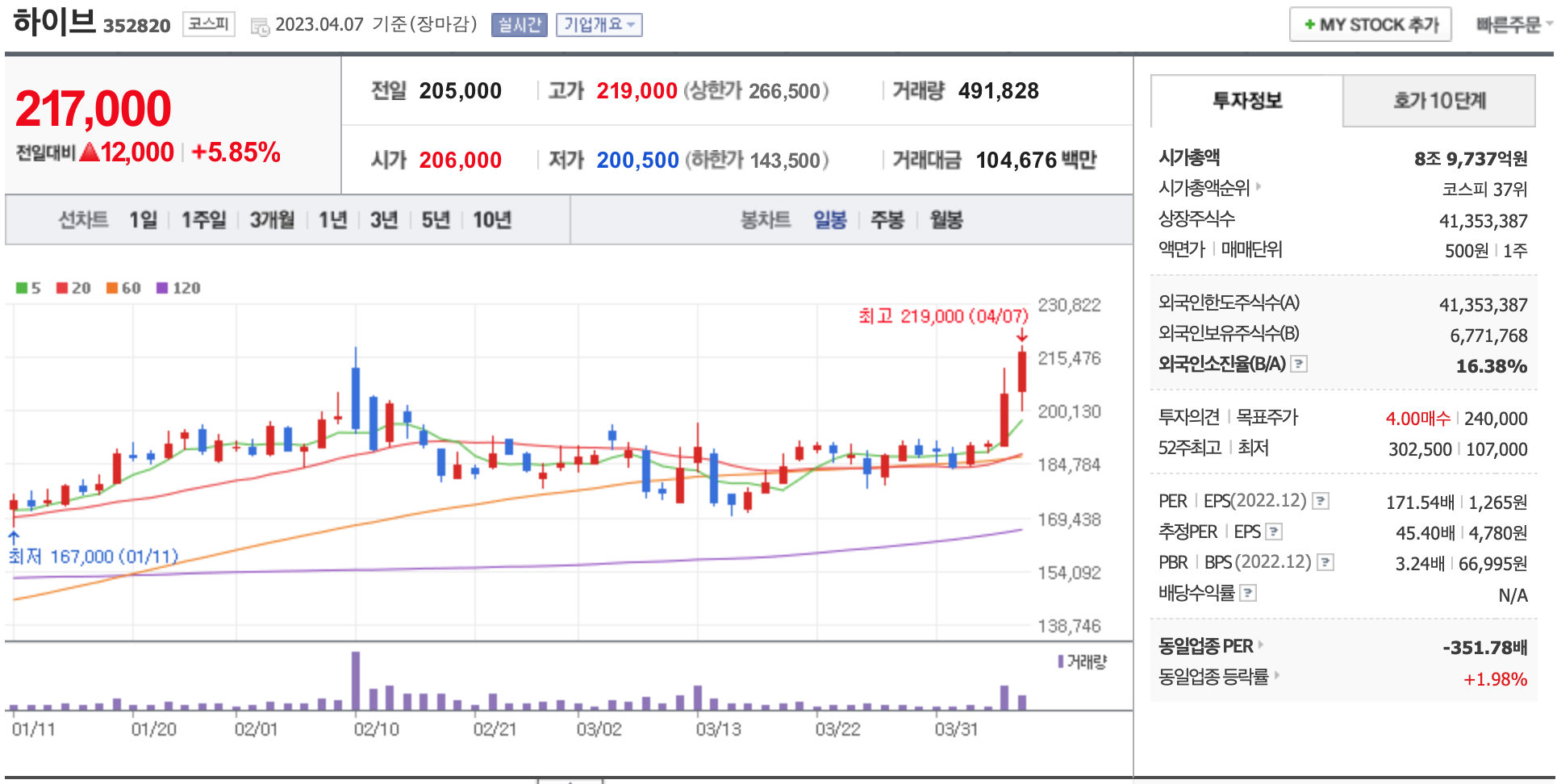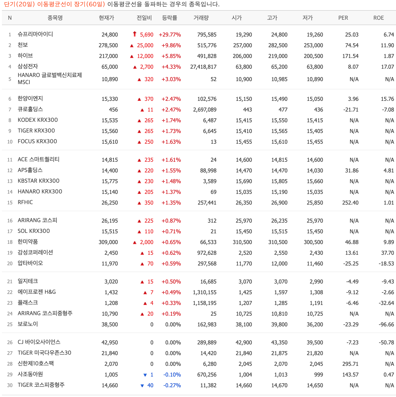 2023년 4월 7일 골든크로스 발생 주식 종목 정보 : 슈프리마아이디,천보,하이브,삼성전자,한양이엔지,큐로홀딩스,APS홀딩스,RFHIC,한미약품,감성코퍼레이션,압타바이오,일지테크,에이프로젠 H&G,..