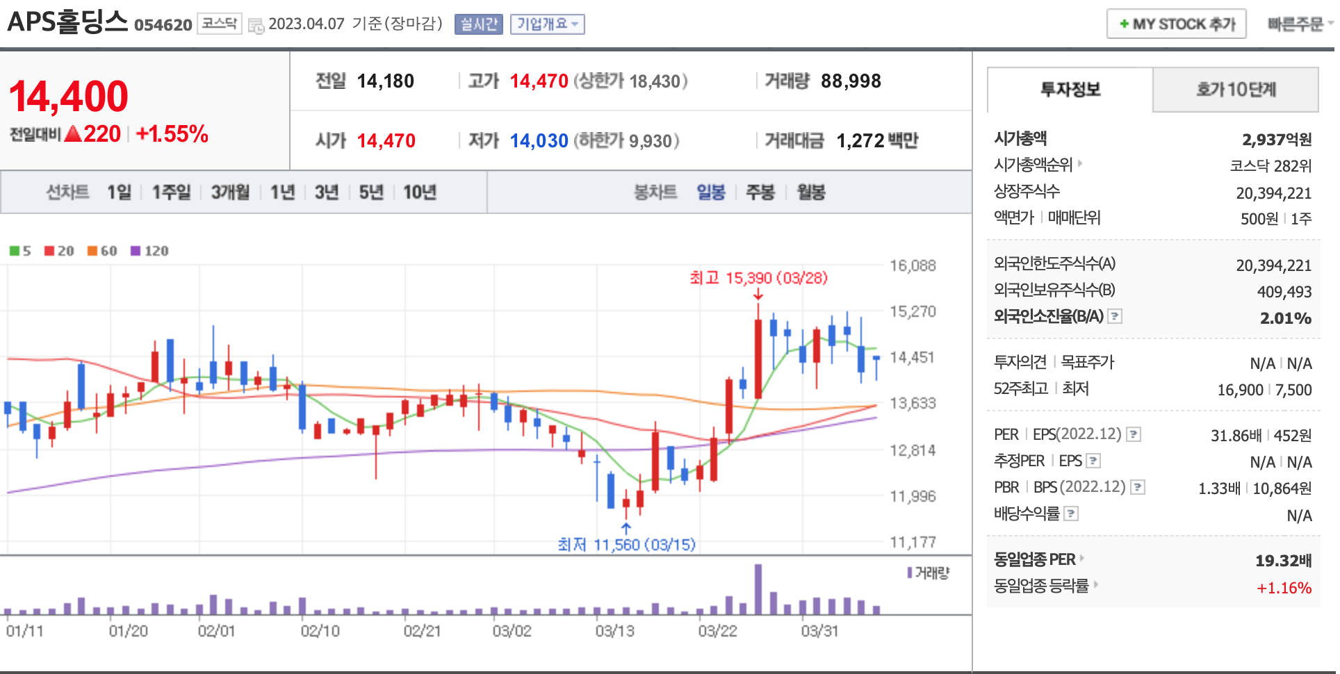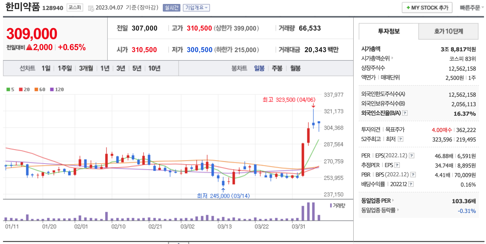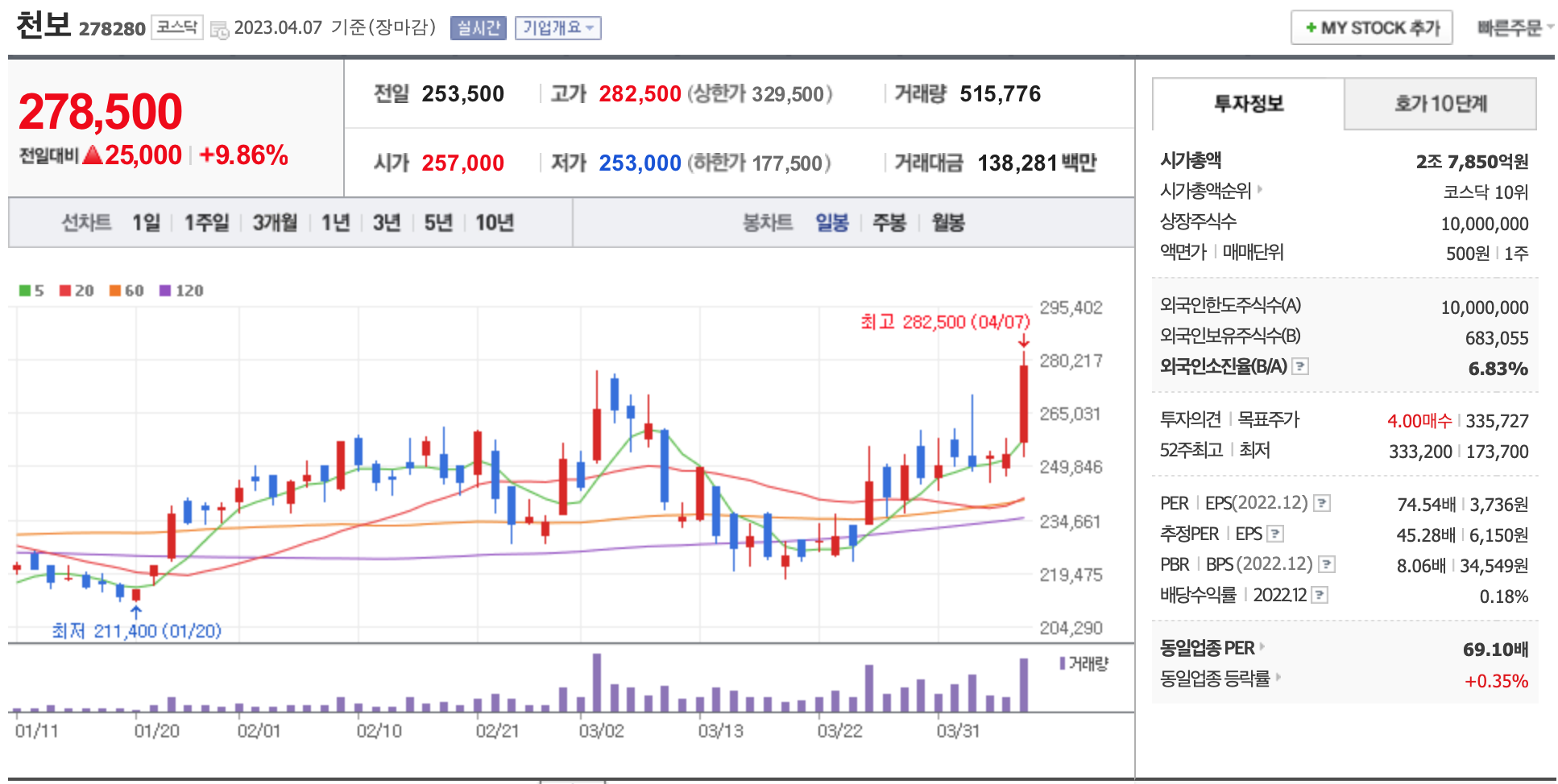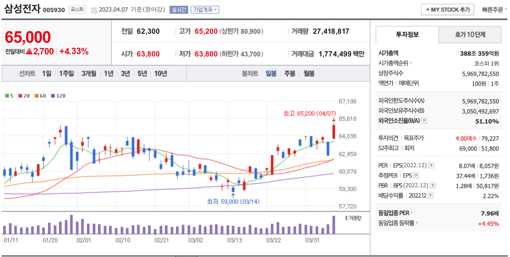 시가총액, 시가총액 순위, 상장주식수, 액면가, 매매단위, 외국인한도주식수, 외국인소진율, 투자의견, 목표주가, 52주 최고, 52주 최저, PER, EPS, PBR, BPS, 배당수익률, 동일업종 PER, 동일업종 등략률 등의 정보를 확인하세요.
