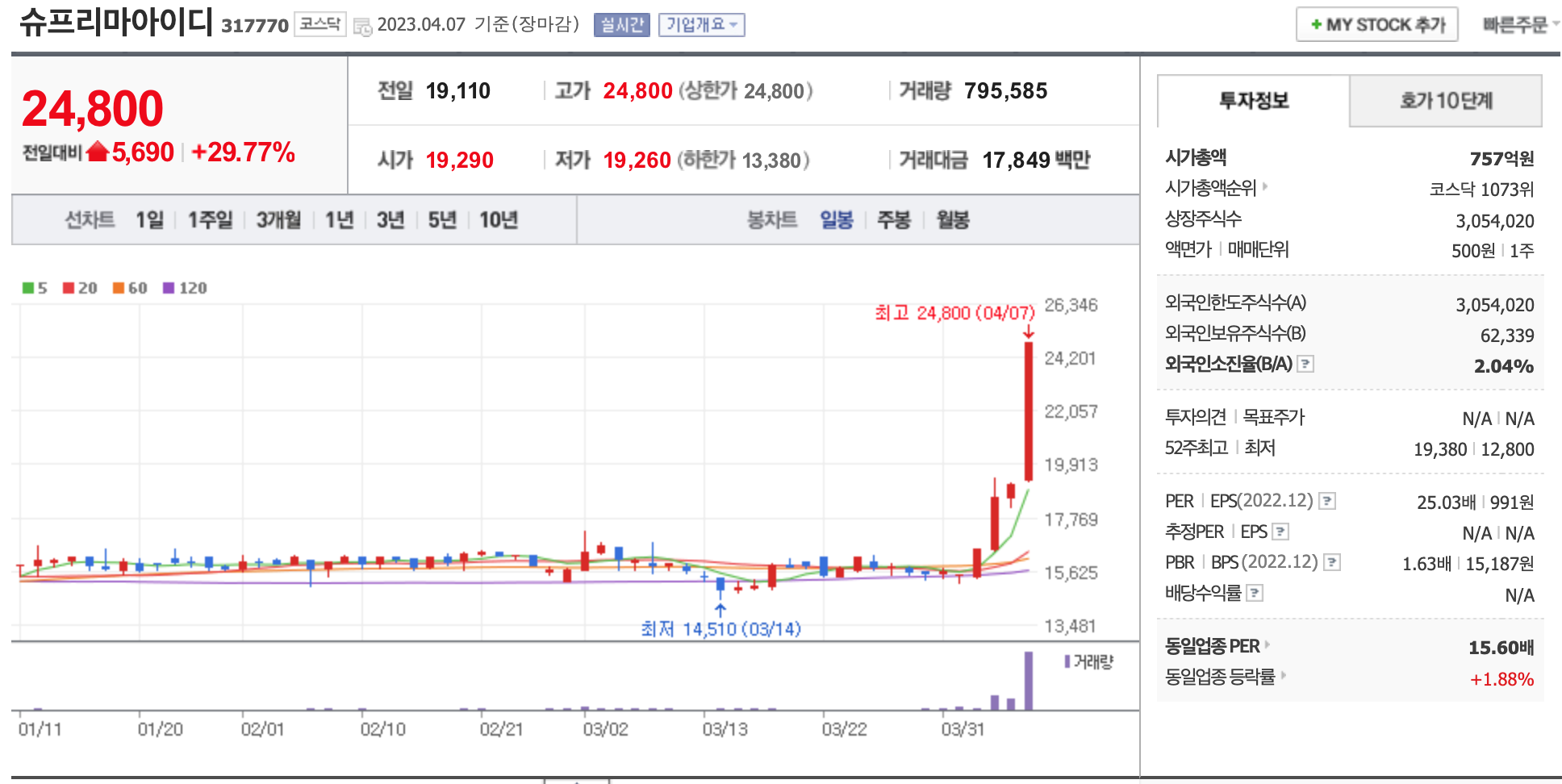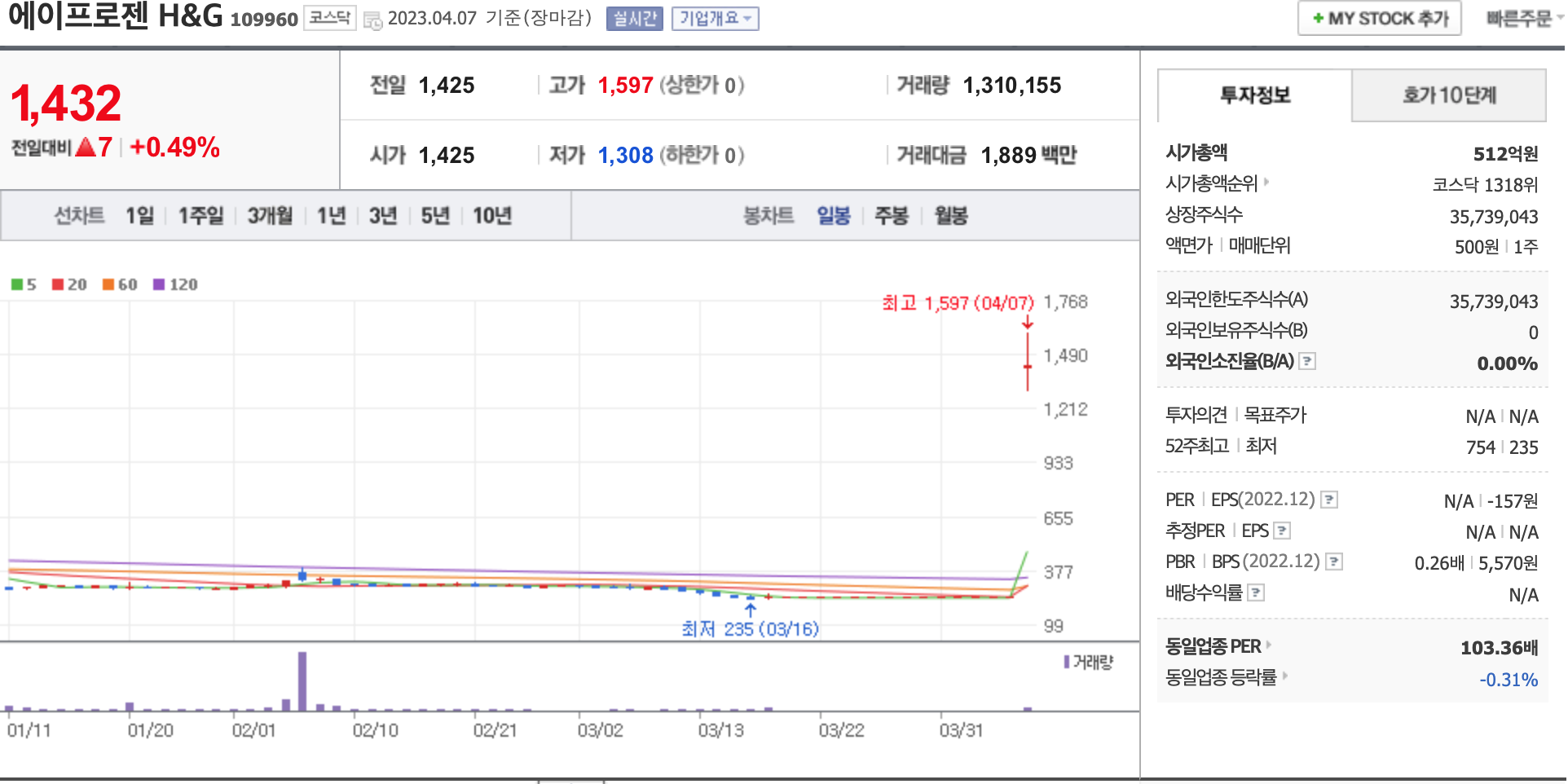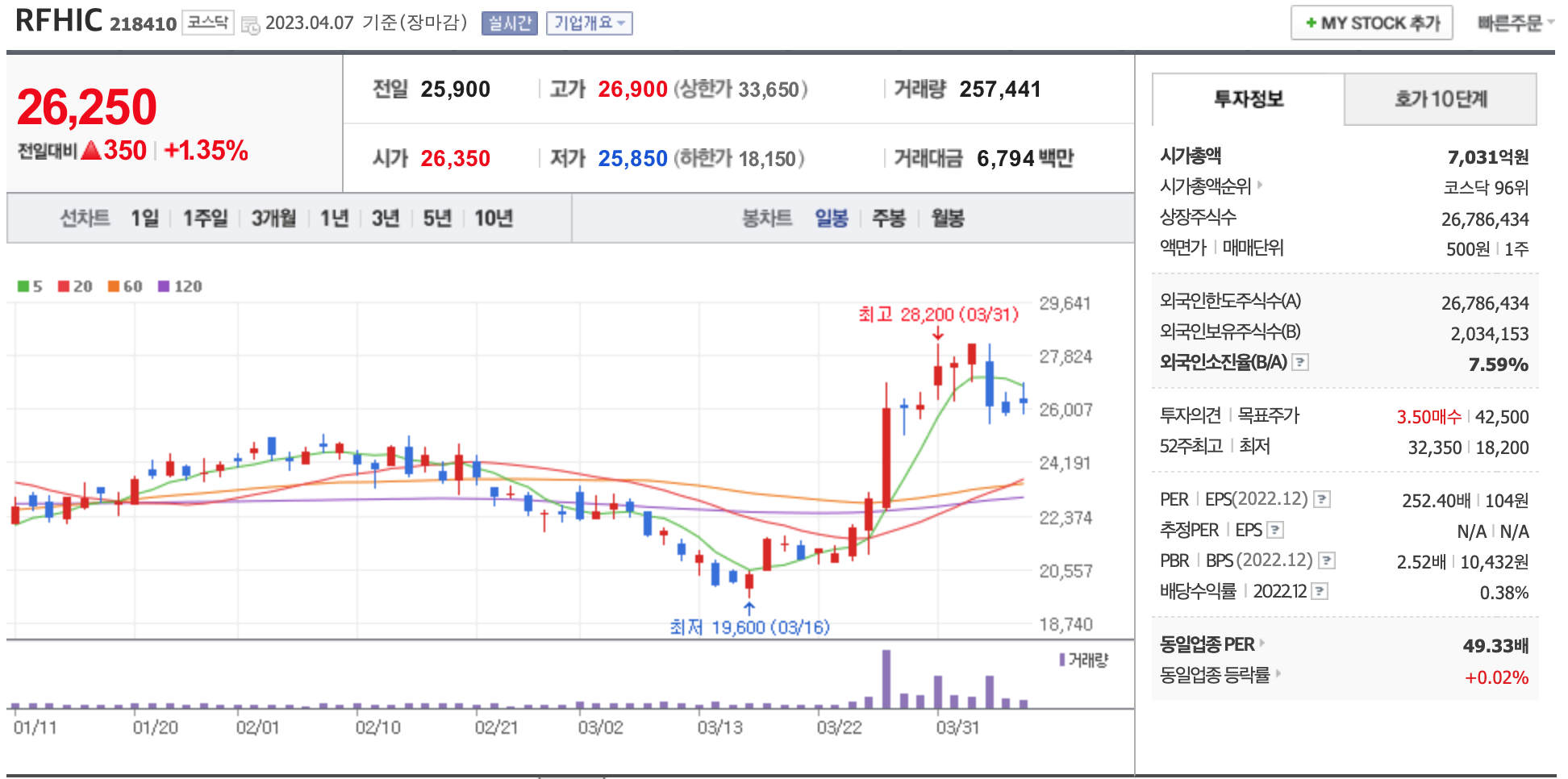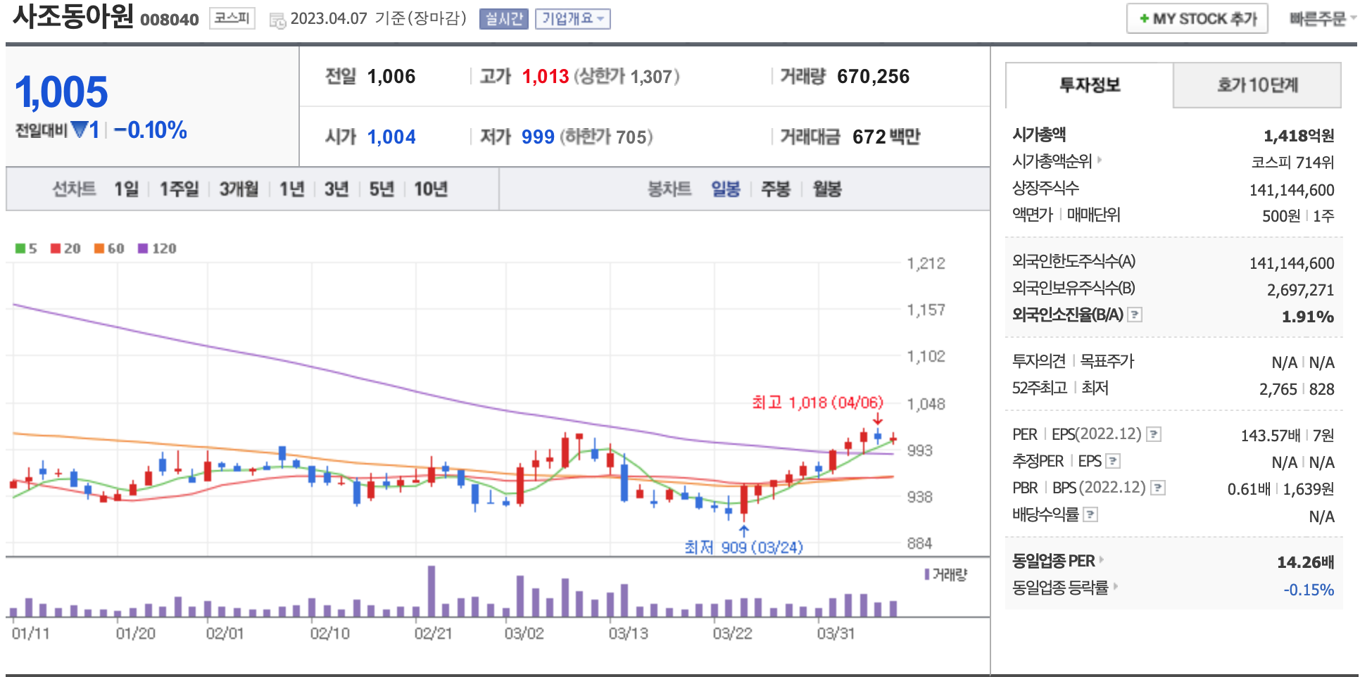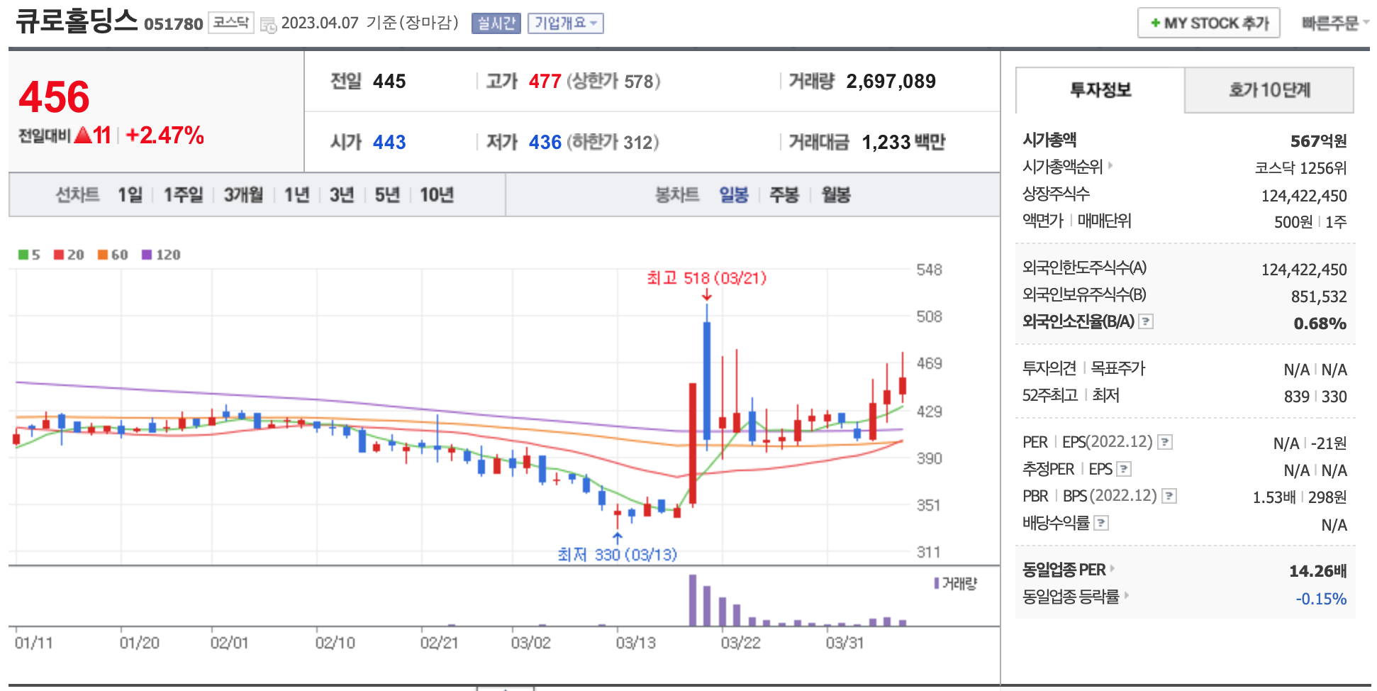 시가총액, 시가총액 순위, 상장주식수, 액면가, 매매단위, 외국인한도주식수, 외국인소진율, 투자의견, 목표주가, 52주 최고, 52주 최저, PER, EPS, PBR, BPS, 배당수익률, 동일업종 PER, 동일업종 등략률 등의 정보를 확인하세요.