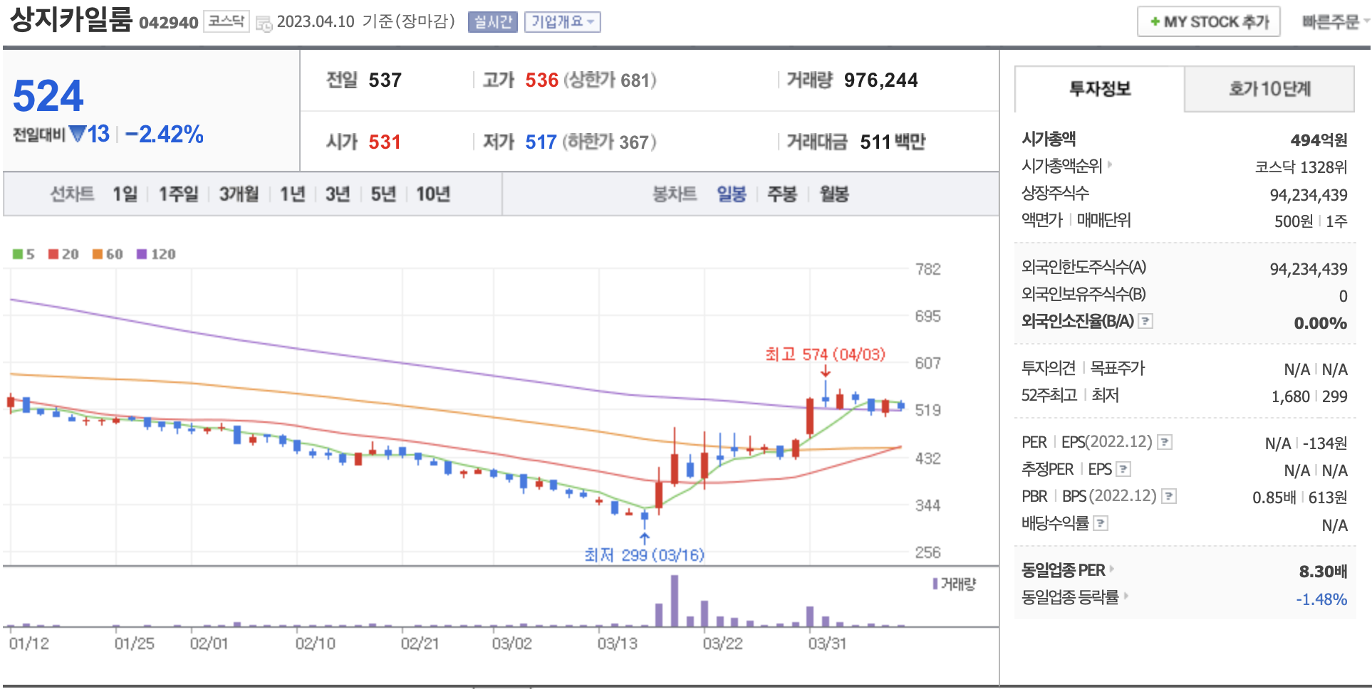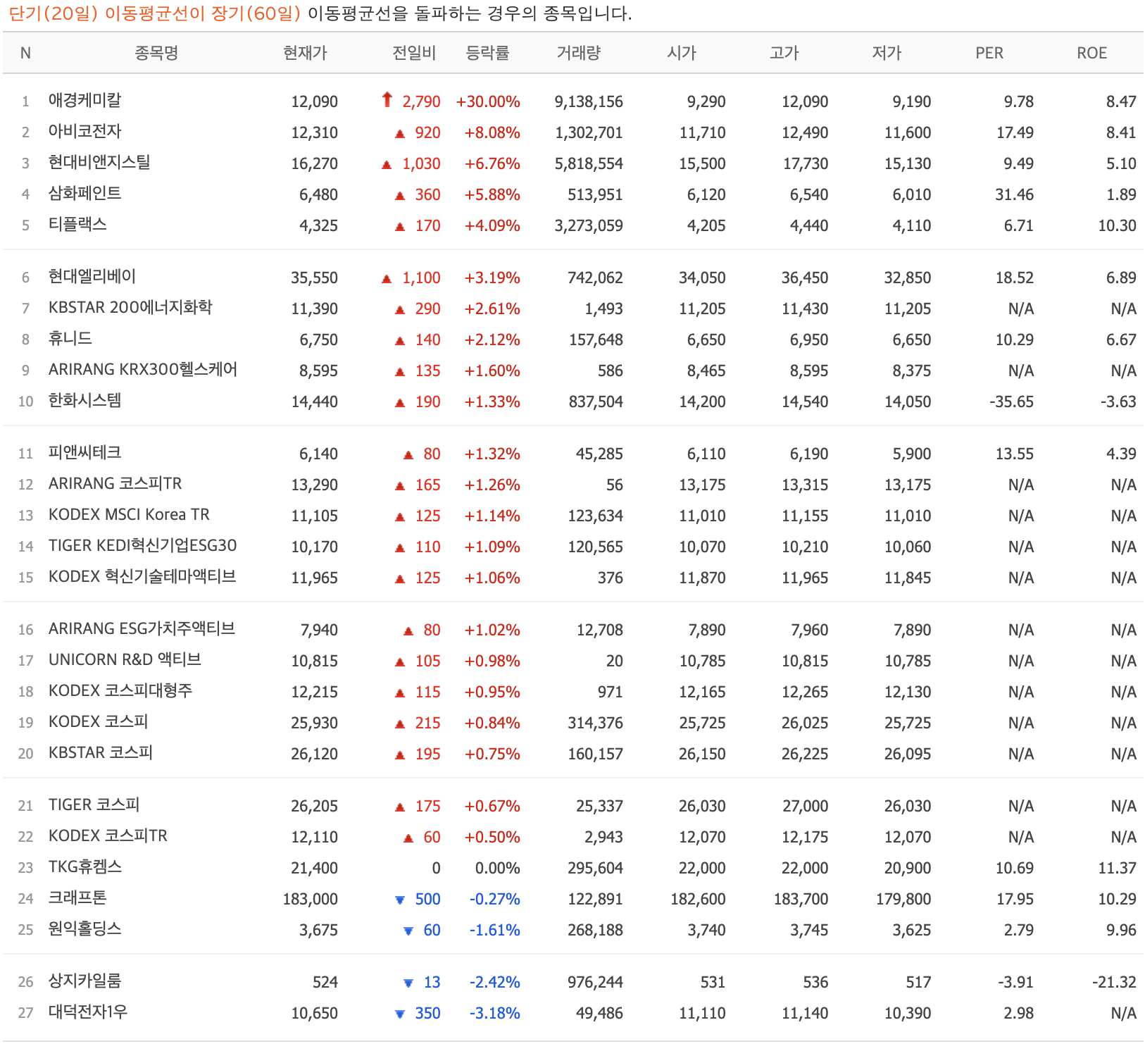 다음 종목들은 2023년 4월 4일 장종료 기준으로 단기(20일) 이동평균선이 장기(60일) 이동평균선을 돌파하는 경우의 종목입니다.