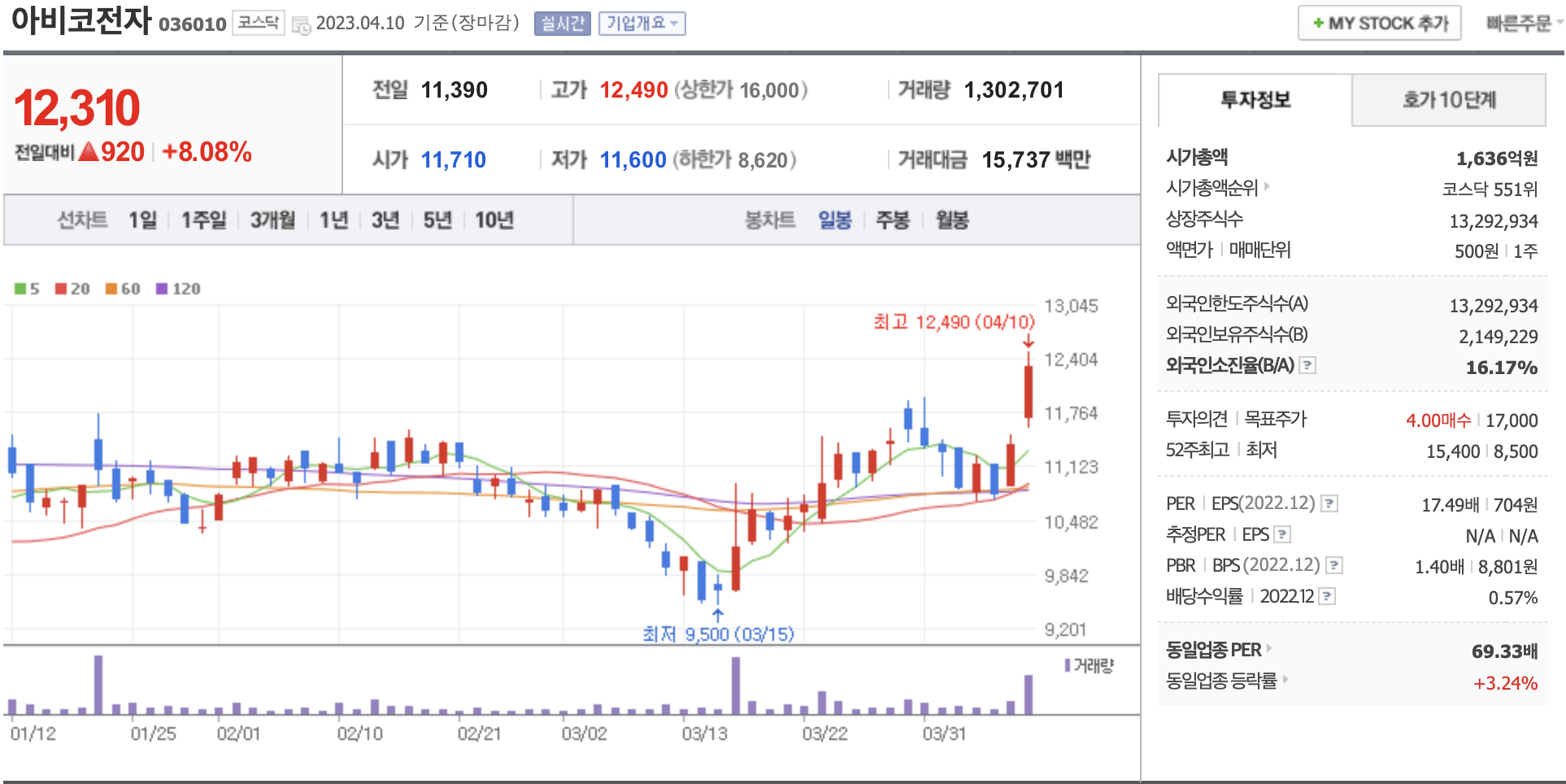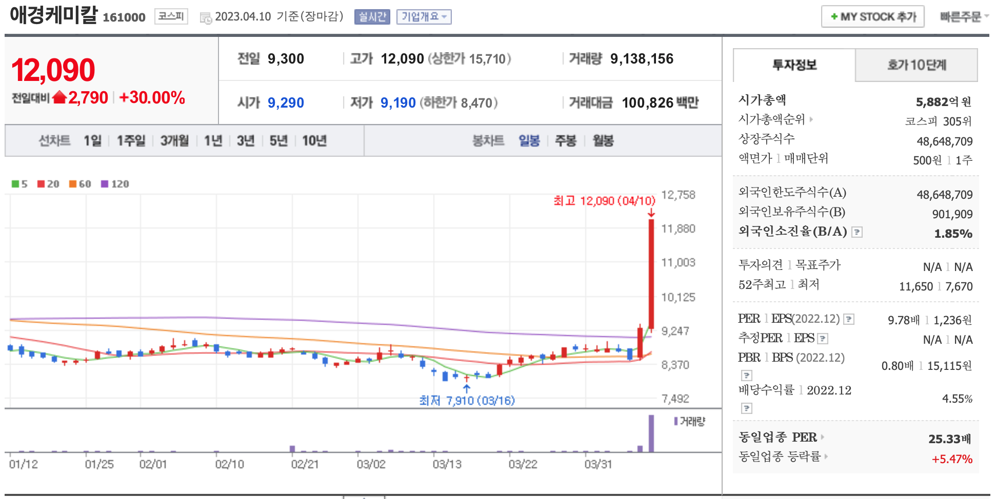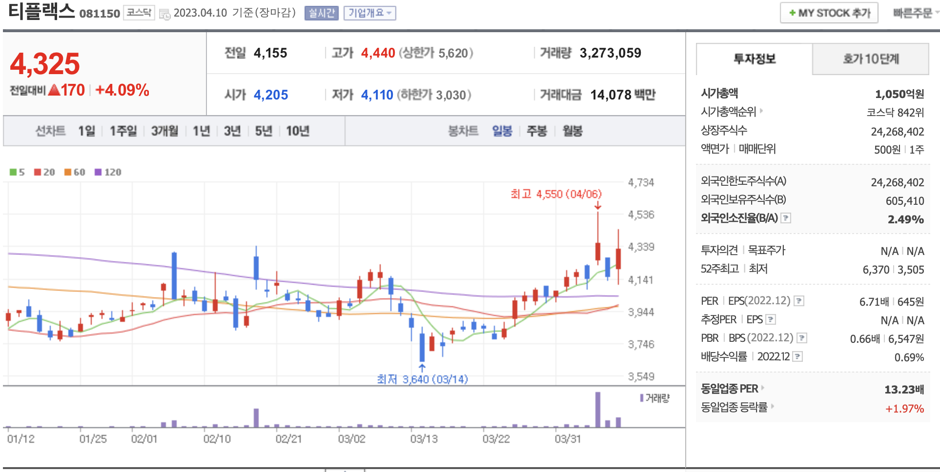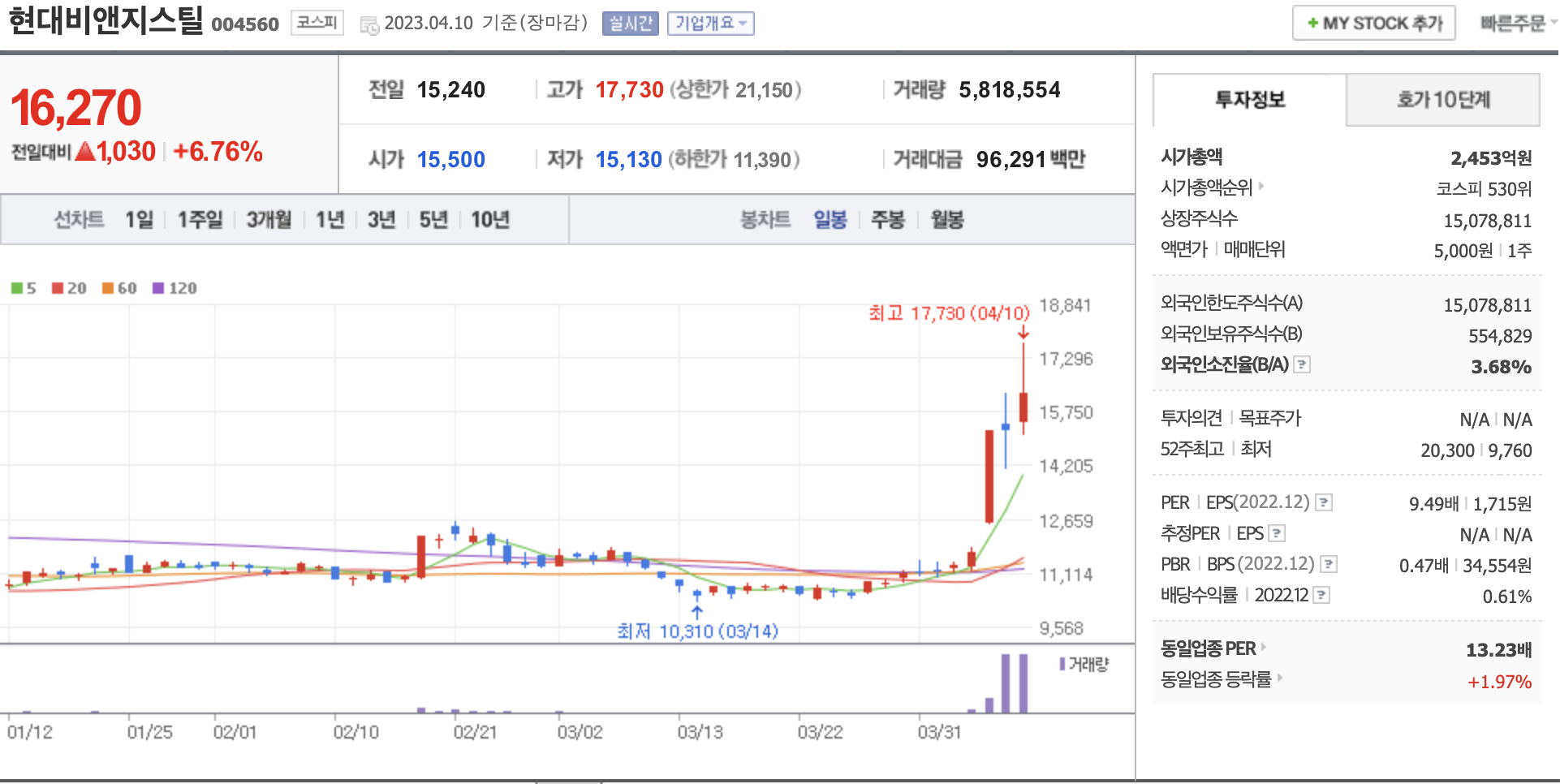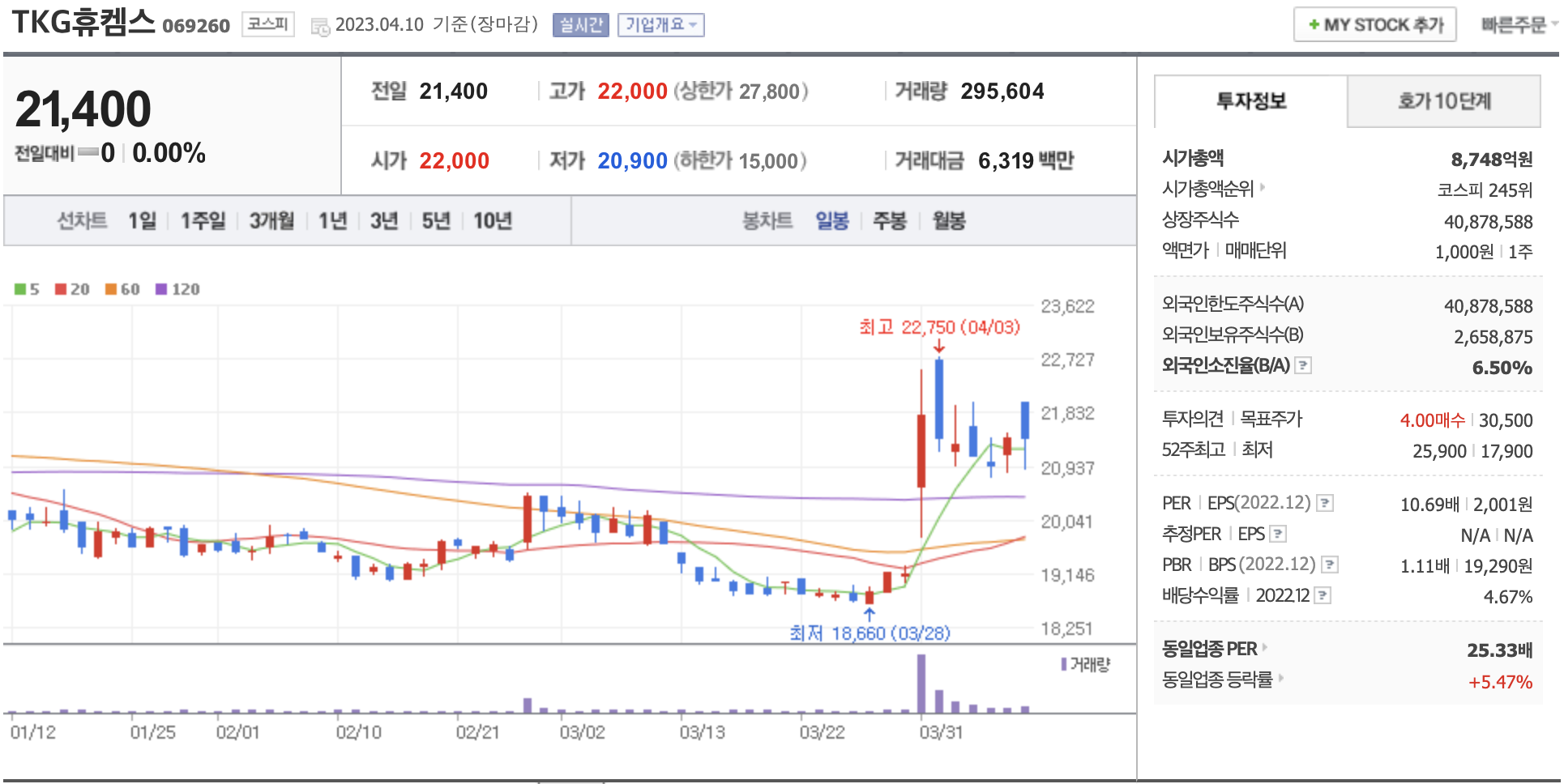2023년 4월 10일 골든크로스 발생 주식 종목 정보 : 애경케미칼,아비코전자,현대비앤지스틸,삼화페인트,티플랙스,현대엘리베이,휴니드,한화시스템,피앤씨테크,TKG휴켐스,크래프톤,원익홀딩스,..